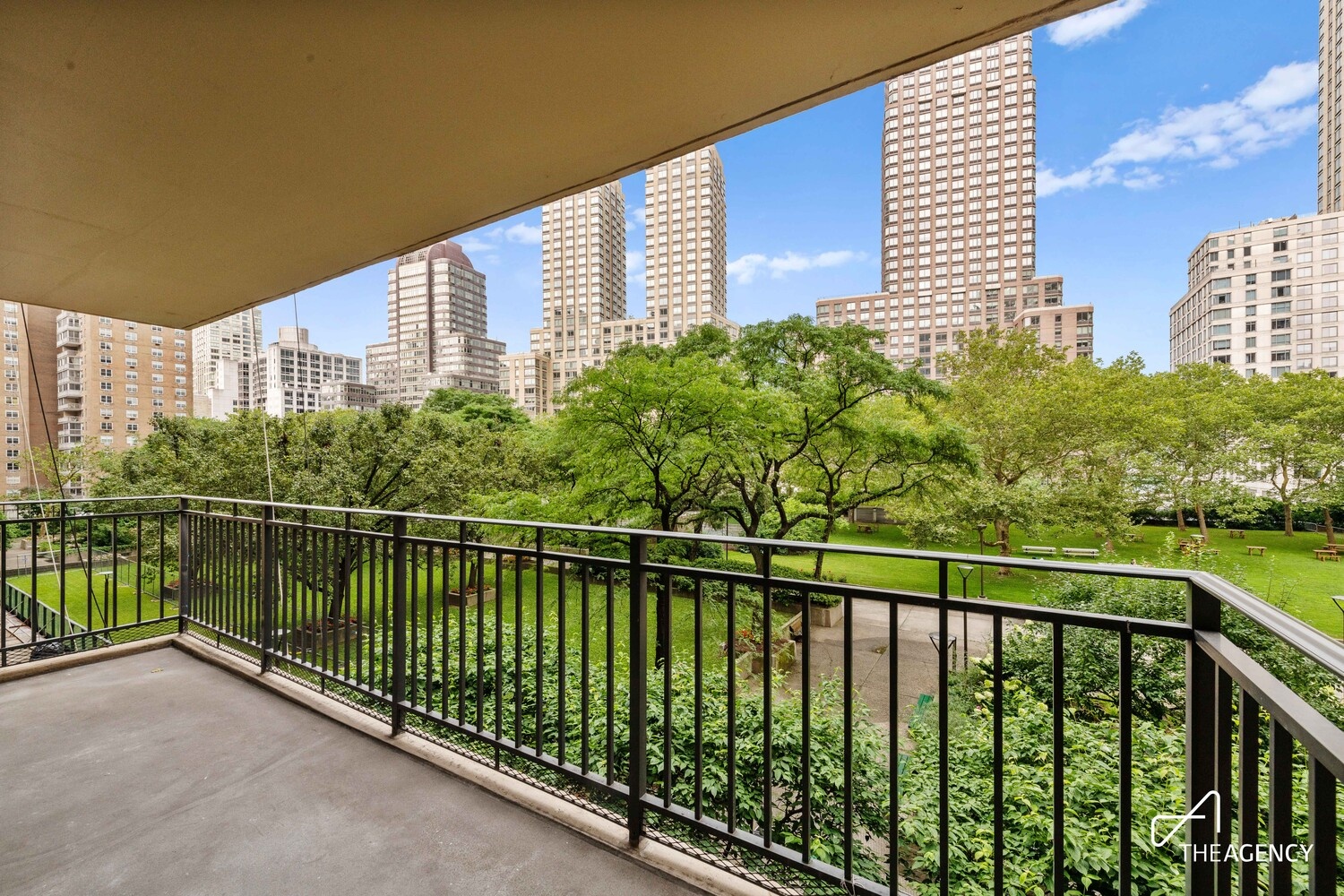 This large two-bedroom apartment with a dining area and terrace has great closets and an expanse of windows which all face west, and very peaceful, pleasant views over the lovely trees, gardens, playgrounds, pickleball and basketball courts, picnic tables and recreational facilities of the private, gated Lincoln Towers park.