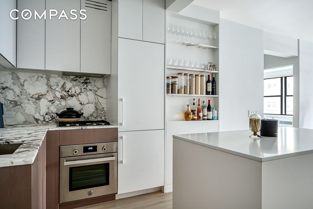 The thoughtfully designed open chef’s kitchen features a Bertazzoni range, integrated refrigerator, and Breccia Capraia marble countertops and backsplash. A large island with a built-in wine fridge offers additional counterspace and storage, is ideal for cooking and entertaining.