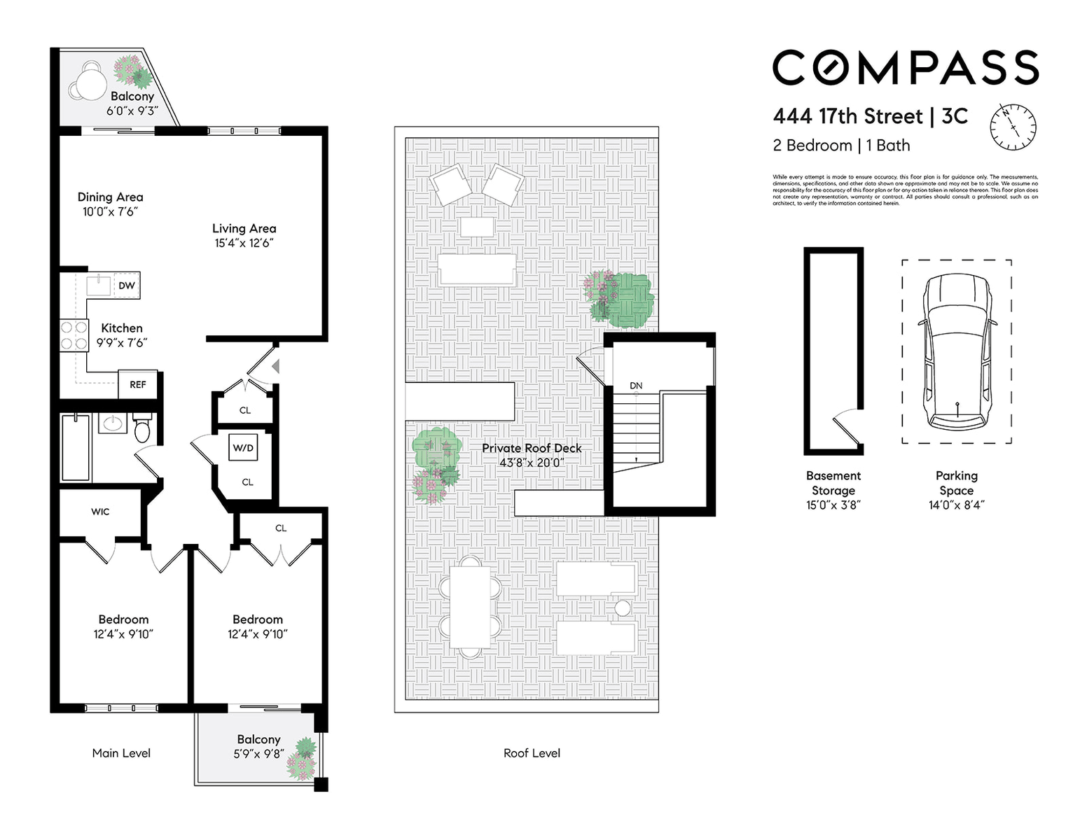 Welcome to 444 17th Street, #3C — a beautifully designed two-bedroom condominium in the heart of South Slope. Thoughtfully laid out and exceptionally well-appointed, this home checks every box the savvy buyer is looking for: private outdoor space, abundant natural light, private parking, and proximity to Prospect Park. Add in private storage, low monthlies, central air conditioning, and in unit laundry, and the value here is hard to match. A 421A tax abatement in place through 2033 keeps monthly costs remarkably low. The living and dining area is bright and expansive — ideal for everyday living and entertaining — and flows directly onto a front-facing balcony, creating a seamless indoor-outdoor connection. The open kitchen is both functional and stylish, featuring granite countertops, abundant cabinetry, generous prep space, and a vented exhaust hood. Down the hallway, a dedicated laundry closet with an LG washer/dryer and substantial storage offers the kind of convenience rarely found in condo living. The beautifully finished bathroom features floor-to-ceiling tile and a deep soaking tub. Both bedrooms are quiet, spacious, and well-positioned overlooking the backyards of Park Slope. The primary includes a walk-in closet. The second bedroom has ample closet space and access to a large, serene balcony ideal for unwinding after a busy day. Above it all, approximately 1,000 sf of exclusive roof rights spans the entire space above the unit, offering panoramic Manhattan skyline views and spectacular sunsets — an exceptional setting for entertaining, barbecuing, or simply lounging. 444 17th Street is a pet-friendly boutique condominium set on a picturesque, tree-lined block where Park Slope meets Windsor Terrace — perfectly positioned for the best of Brooklyn living. Morning walks and bike rides in Prospect Park, coffee at Windsor Terrace Coffee, and neighborhood favorites like Krupa Grocery, Double Windsor, Giuseppina's, Giovanni's, Folk, Winner, and Fonda are all just moments away. Catch a movie at Nitehawk Cinema, browse the shops and cafés along 7th Avenue and Prospect Park West, and commute with ease via the F and G trains at 15th Street–Prospect Park, with quick access to Downtown Brooklyn and Manhattan. Low carrying costs, multiple outdoor spaces, private parking, storage, bike storage, and roof rights — this is one of the most compelling opportunities in the neighborhood right now.