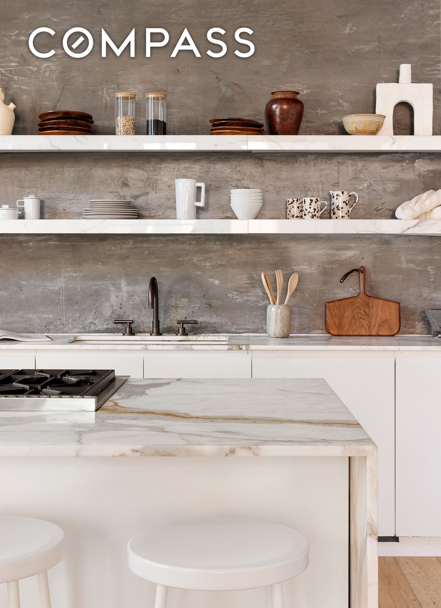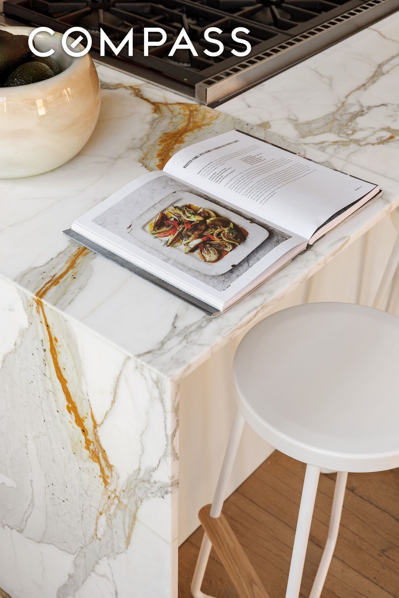 At the heart of the loft, the kitchen is confident and restrained. Calacatta Macchia Vecchia marble anchors the space, complemented by custom cabinetry, integrated appliances, and abundant storage organized around a substantial island—ideal for both daily living and entertaining.