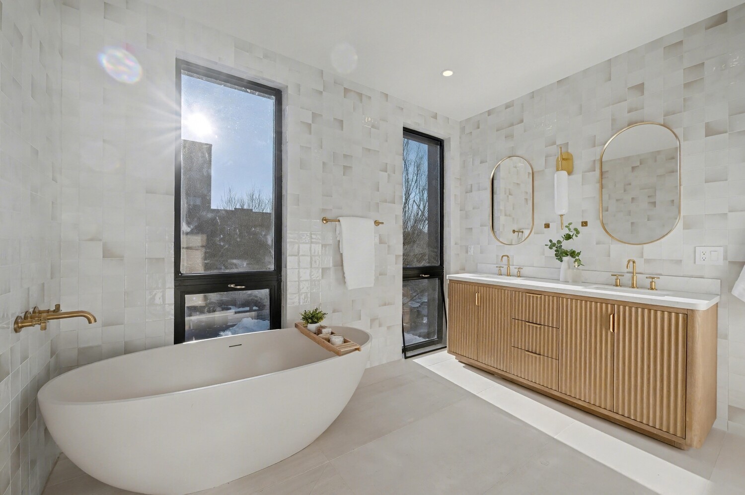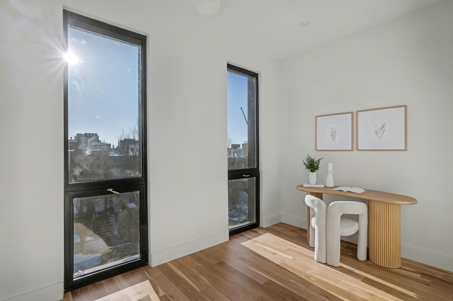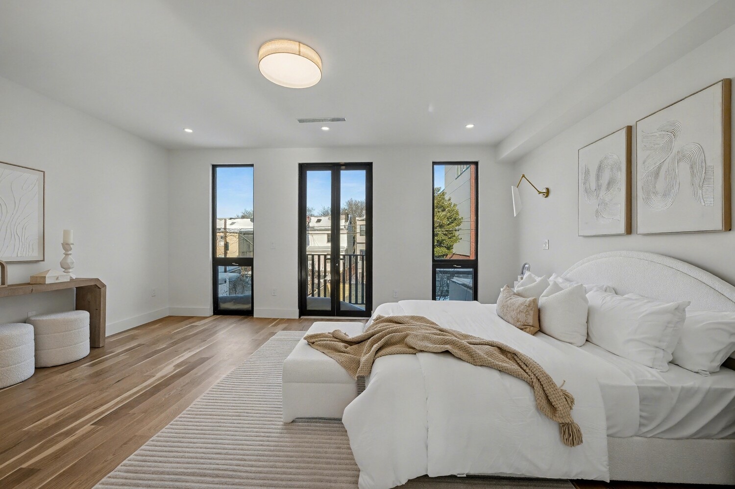 The entire middle floor is dedicated to an exceptional primary suite. Grand in scale, it offers a Juliet balcony overlooking the garden, an oversized walk-in closet and dressing room, and a spa-like bathroom with a freestanding soaking tub, oversized shower, and private water closet. A dedicated home office on this floor provides the perfect work-from-home retreat.