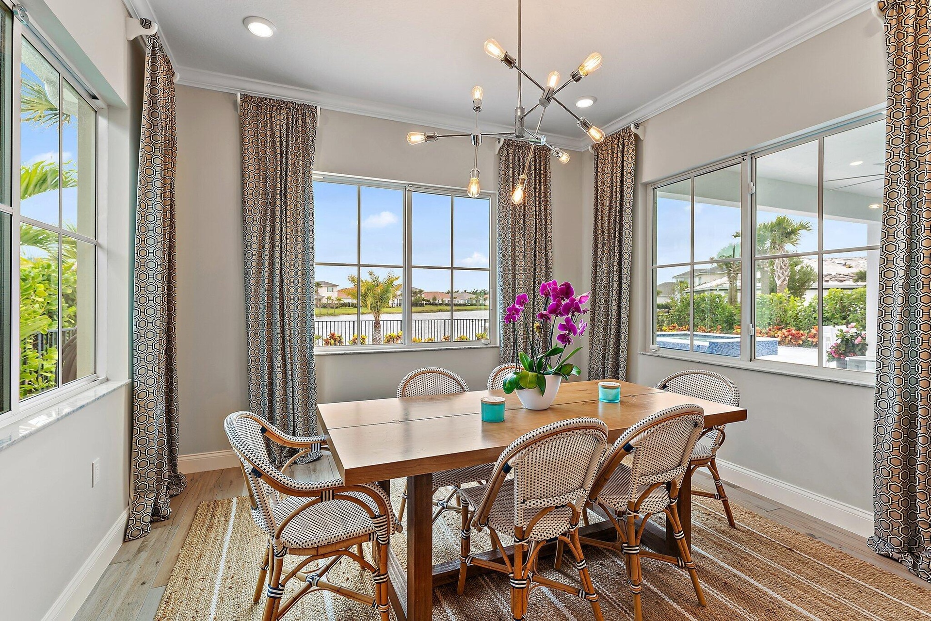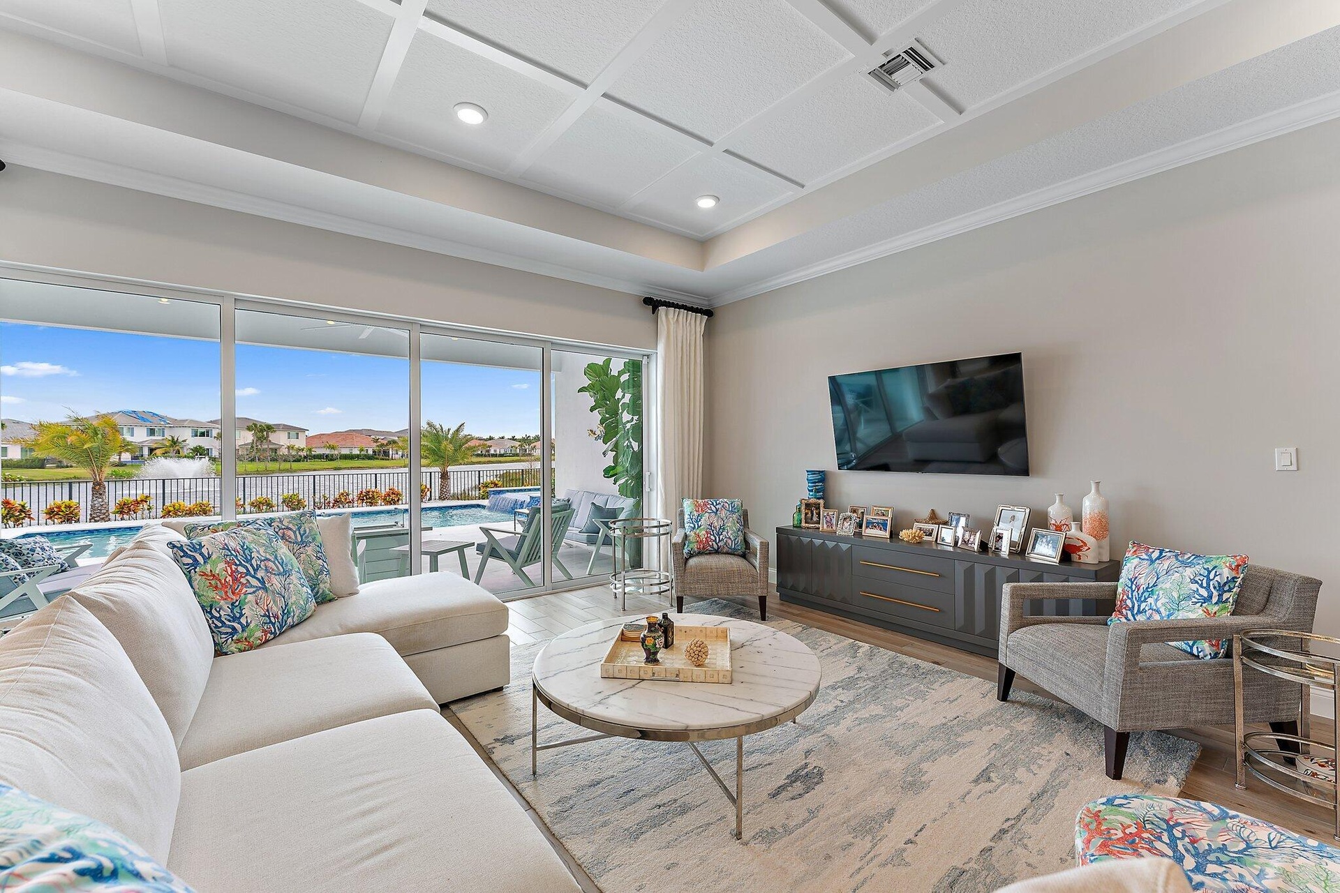 Enjoy stunning wide lake views from the back yard of this professionally decorated home built by K.