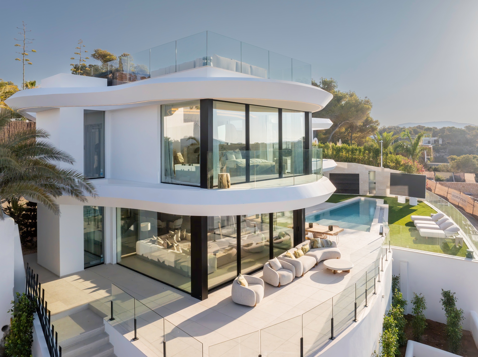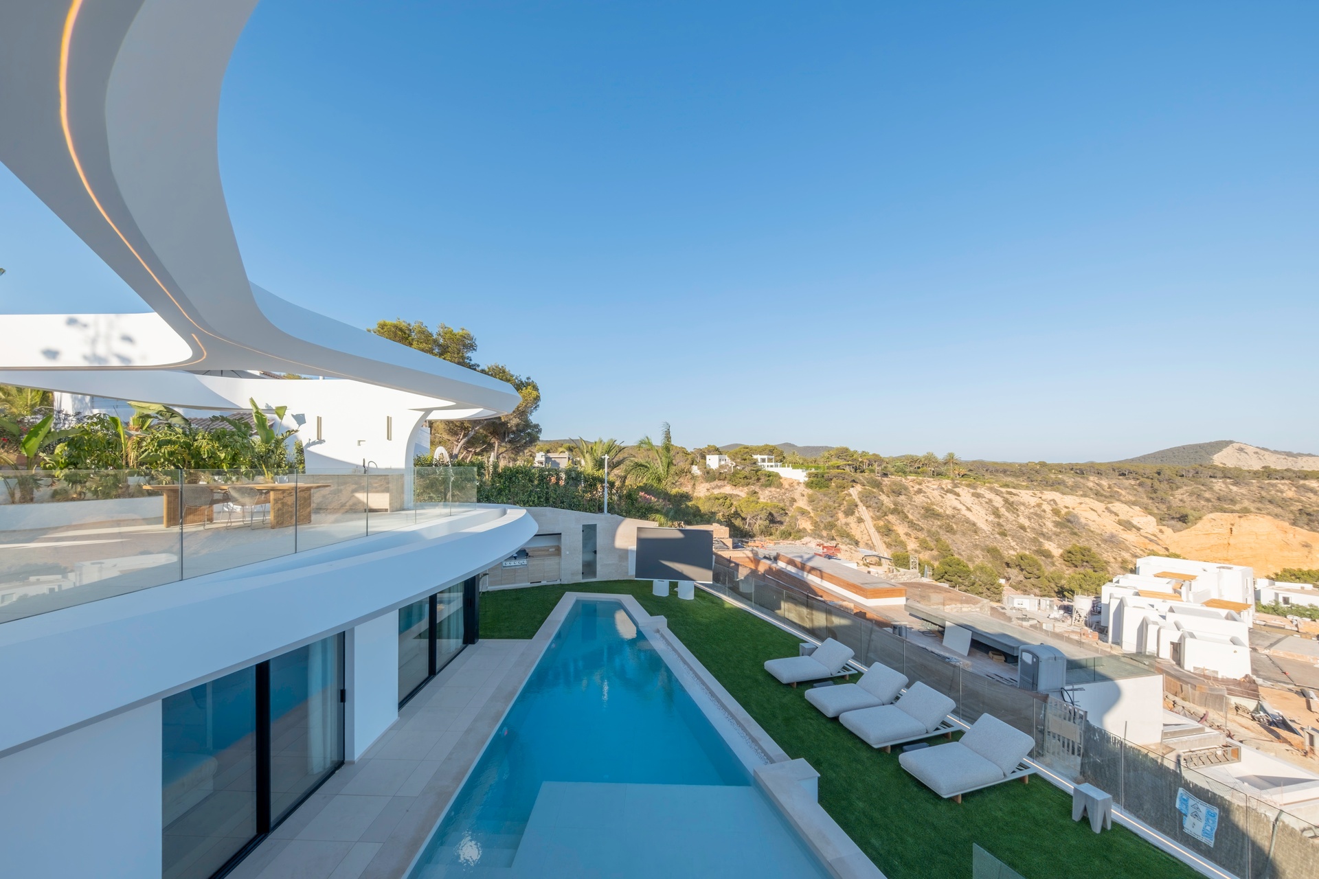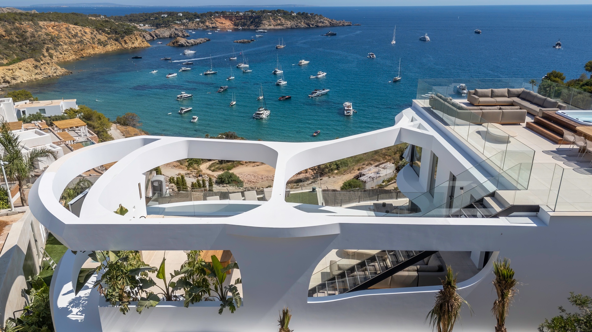 Expansive terraces, multiple chill-out areas, and a private pool create an ideal setting for enjoying Ibiza’s lifestyle. A rooftop terrace with jacuzzi provides a spectacular space for sunset views and social gatherings.