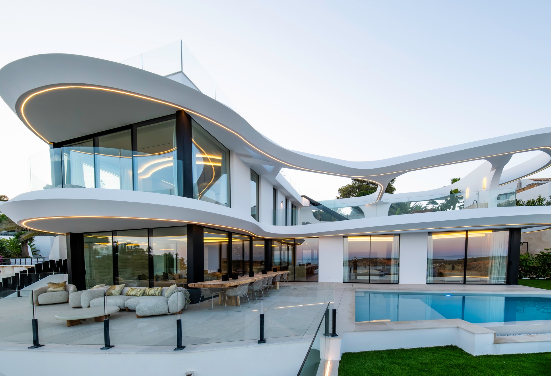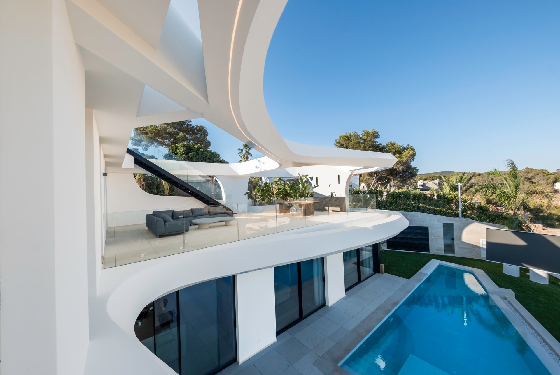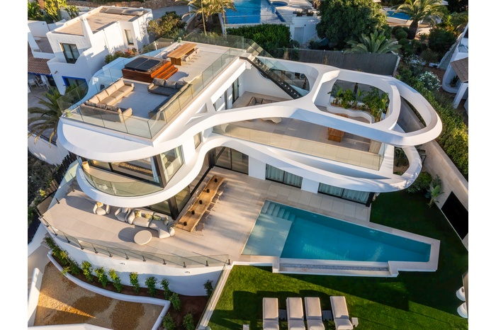 Inspired by the natural movement of the sea, the villa’s wave-like design creates a bold and fluid architectural identity, while floor-to-ceiling glass enhances natural light and seamlessly connects indoor and outdoor living spaces.