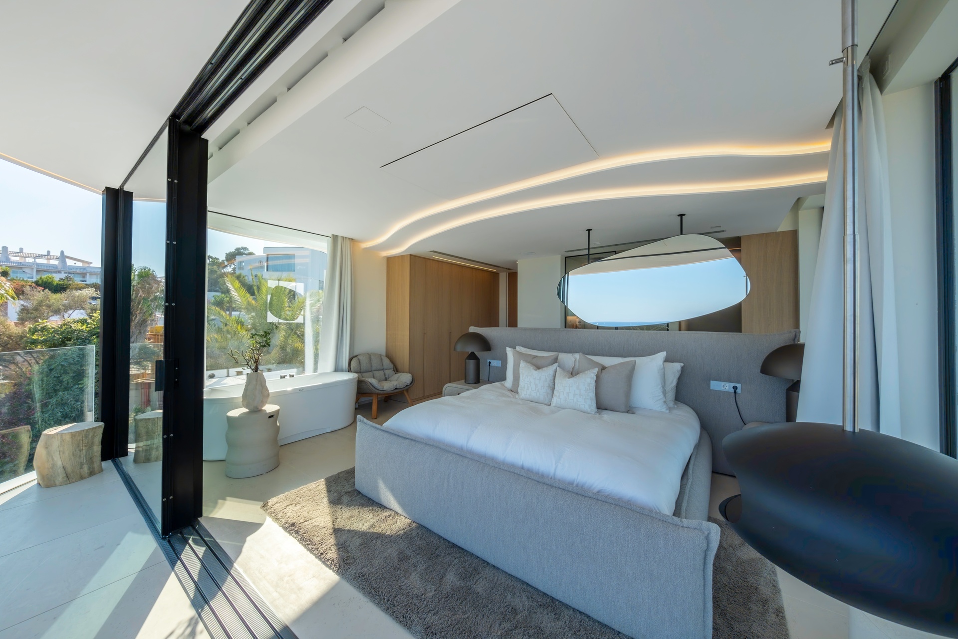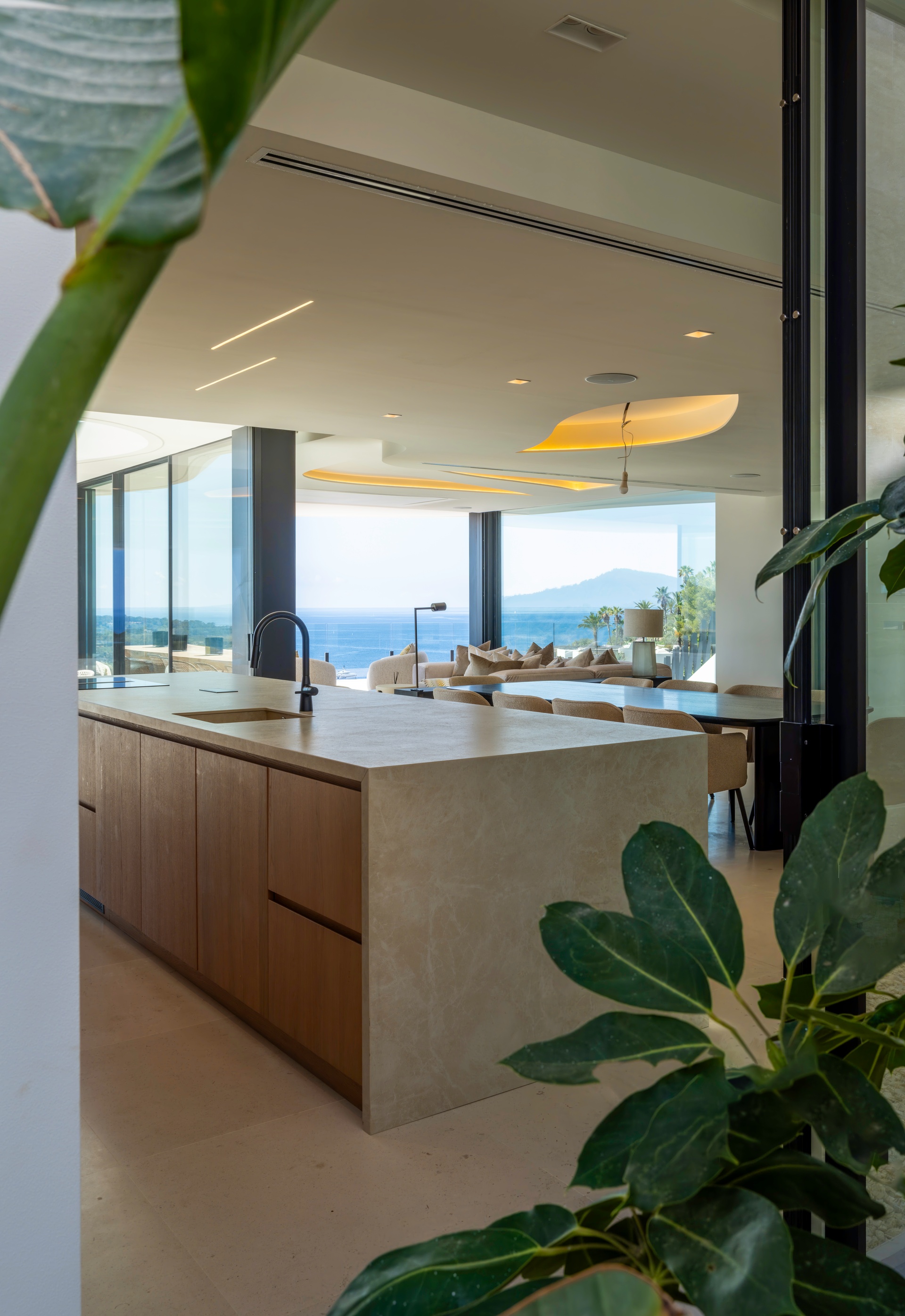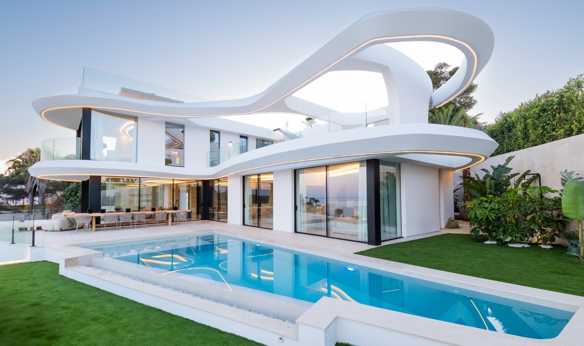 Inspired by the natural movement of the sea, the villa’s wave-like design creates a bold and fluid architectural identity, while floor-to-ceiling glass enhances natural light and seamlessly connects indoor and outdoor living spaces.