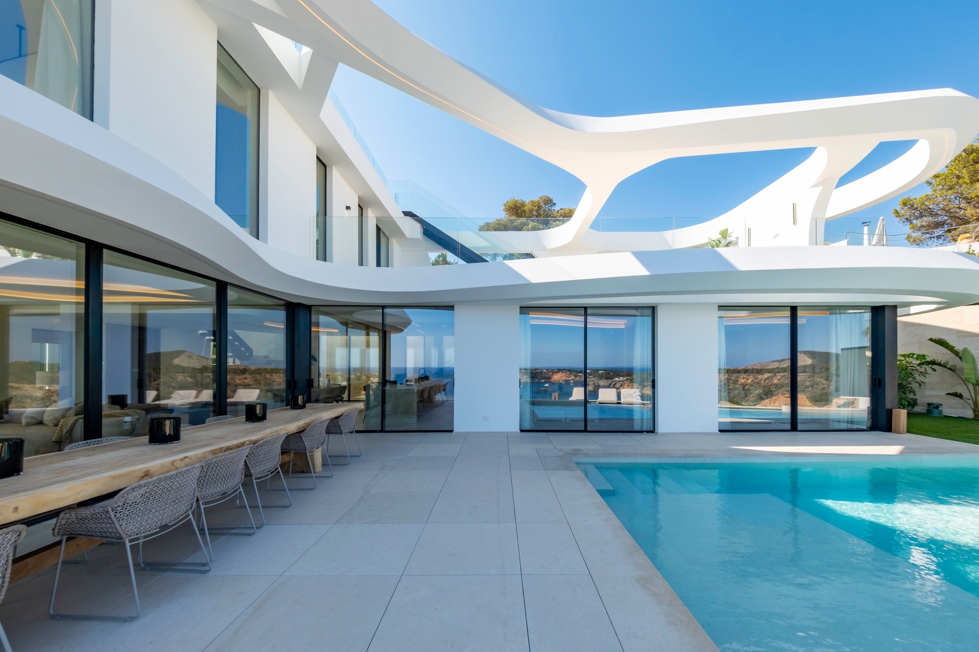 Located in the prestigious gated community of Vista Alegre, Villa Banús is a striking architectural masterpiece that redefines contemporary luxury living in Ibiza. Elevated above the coastline, the villa offers uninterrupted panoramic views of the Mediterranean and Ibiza’s world-famous sunsets.