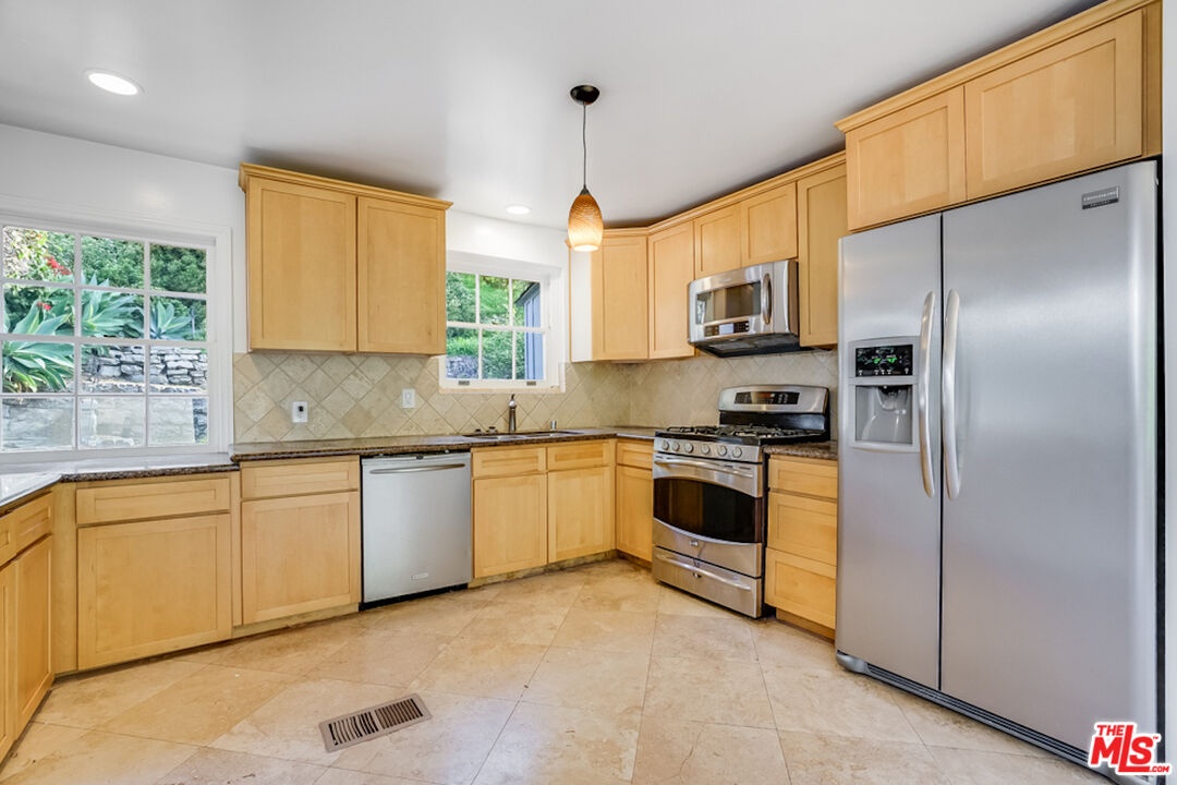 A Charming Hollywood cottage for lease located in the highly coveted Lake Hollywood Knolls, offering modern amenities with original details. Situated behind a wall of well-manicured hedges that provide privacy and serenity, this traditional 2-bed/2-bath home boasts generous natural light throughout, original wall niches, two decorative fireplaces, and ample storage. The updated large eat-in kitchen includes stainless steel appliances and ample cabinetry. The spacious living room with a decorative fireplace is perfect for entertaining and relaxing. The primary suite features lots of closet space, original built-ins, and a beautifully remodeled full bathroom. The second bedroom or den has a decorative fireplace, giving it a cozy atmosphere. The bedroom's closet is adjacent to its bath. An additional bonus room with outdoor access can be used as an office. A loft above the bonus room provides extra storage space. The private hillside backyard features orange and lemon trees as well as space for entertaining. The attached two-car garage, plus parking, is available on the driveway and on the street. There is also an attached bonus room in the garage, perfect for an exercise space or additional storage. The laundry room and home are accessible via stairs and provide direct entry to the main living area. Also note: There are solar panels on the roof to save money on the electric bill! Close to major studios: Universal, Warner Bros., Disney, and Netflix. Shopping close to Whole Foods, Trader Joe's, Ralph's, and Von's Markets, and restaurants. Three-quarters of a mile to the Hollywood Bowl and 12 minutes to the Burbank Airport! The landlord pays the gardener. Both fireplaces are considered decorative only. Only Applicants with excellent credit need to apply! Available April 1. Tenants will be required to carry renters' insurance. A Rentspree application link will be sent to those applying.
