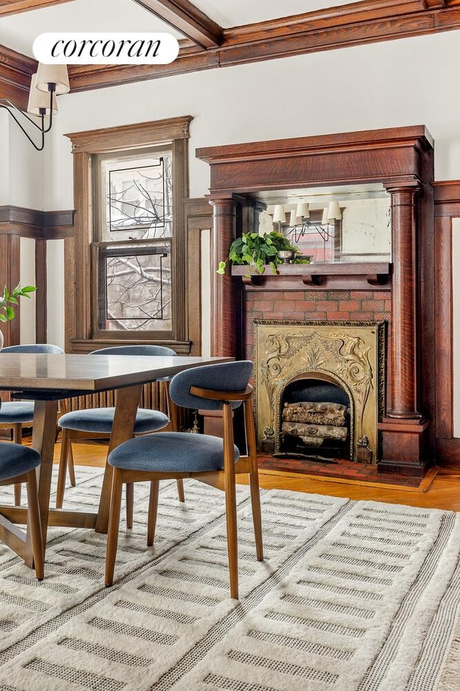 Upon entering, you are welcomed by a gracious mudroom framed in original millwork, an inviting place to hang your hat and coat. Beyond, the home unfolds into a dramatic foyer with soaring 10 foot ceilings, rich ceiling beams, and intricate woodwork throughout. A wood burning fireplace anchors the space, lending warmth and quiet gravitas to this palatial yet intimate architectural setting.
