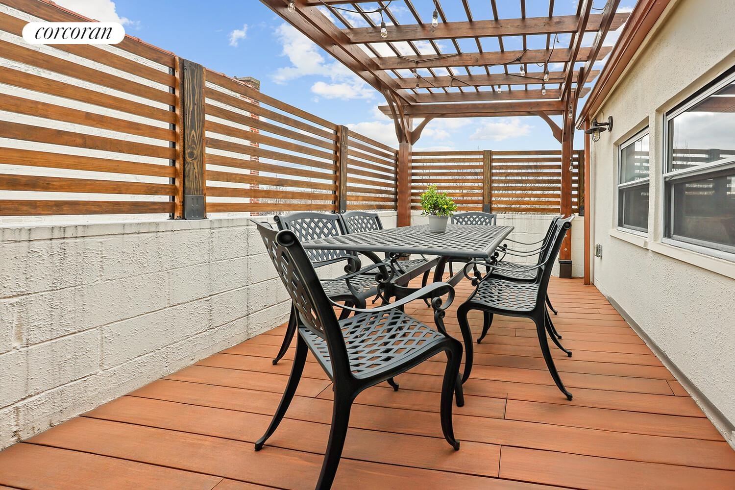 Outside, a private pergola-covered terrace provides a true extension of the living space - a rare Brooklyn luxury perfect for summer dinners, morning coffee, or unwinding at sunset.