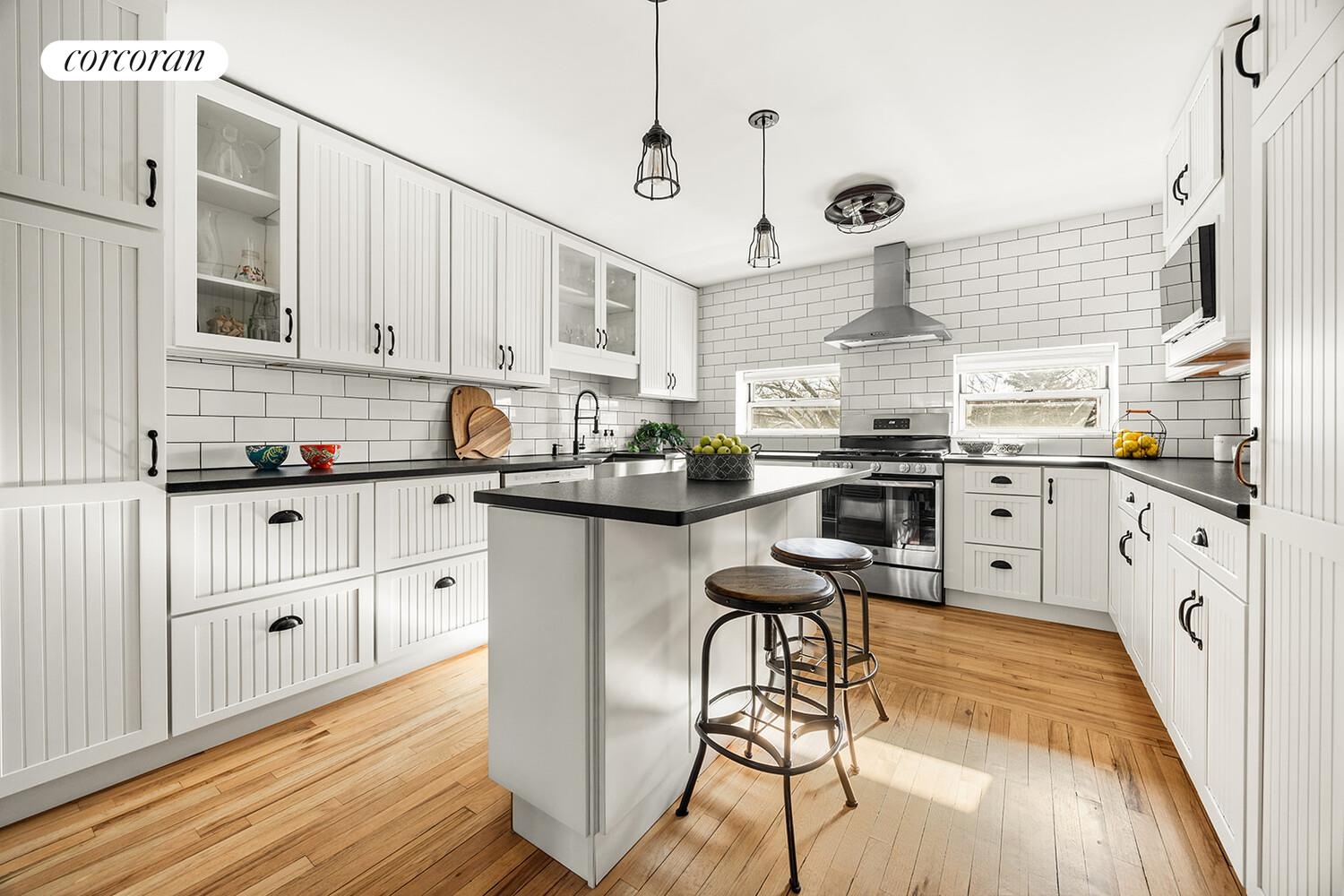 At the heart of the residence is a dramatically expanded, chef's kitchen designed as much for gathering as for function. A generous center island anchors the space, complemented by abundant storage, ample counter space, 5 burner stove with vented hood and an oversized farm sink. The kitchen opens seamlessly to the dining and living areas, with a full bath and oversized coat closet conveniently located on this level. In the living room, a striking steel beam and exposed brick wall add architectural character.