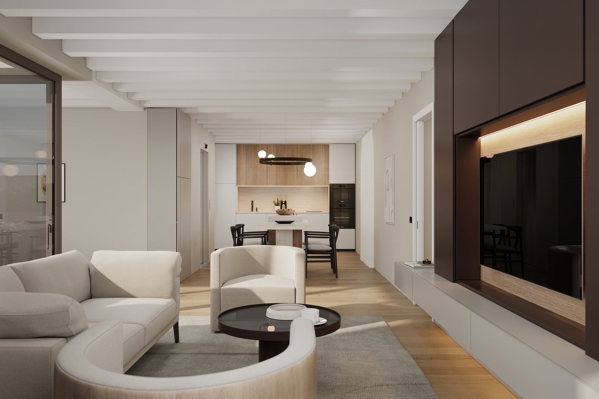 Doors, finishes and detailing are selected to create a coherent, elegant and timeless interior language.
