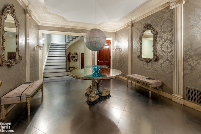 Both grand in scale and warmly inviting, this exceptional home just off Park Avenue offers over 8,100 interior square feet of refined living. From the moment you enter, the impact is immediate. A dramatic entry foyer with soaring ceilings, painted floors, and a sweeping curved staircase creates an unforgettable first impression. A newly installed elevator, accessed from this level, provides service to all four additional floors.