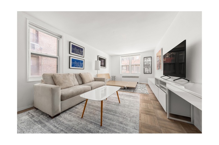 This well-proportioned studio offers a flexible layout that comfortably accommodates living, dining, and sleeping areas. The main living space is bright and inviting, with excellent wall space and classic hardwood floors that add warmth and character. The separate kitchen offers ample cabinetry, a gas range, and a full-size refrigerator, providing a functional layout with strong storage. The bathroom features classic tilework and clean lines, maintaining the timeless character of a traditional West Village home.