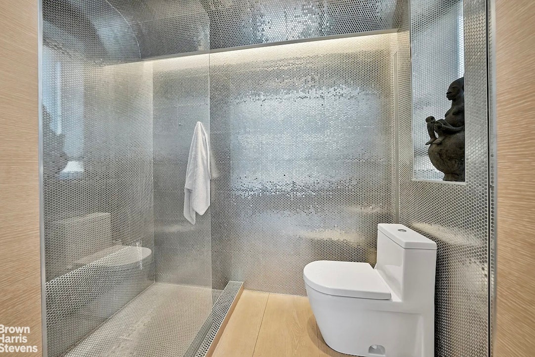 Furnishings by Vladimir Kagan, a custom Jobim 276 coffee table by Aharoni, and other bespoke pieces echo the apartment's graceful silhouettes, blending artful design with modern comfort and are included with the sale.