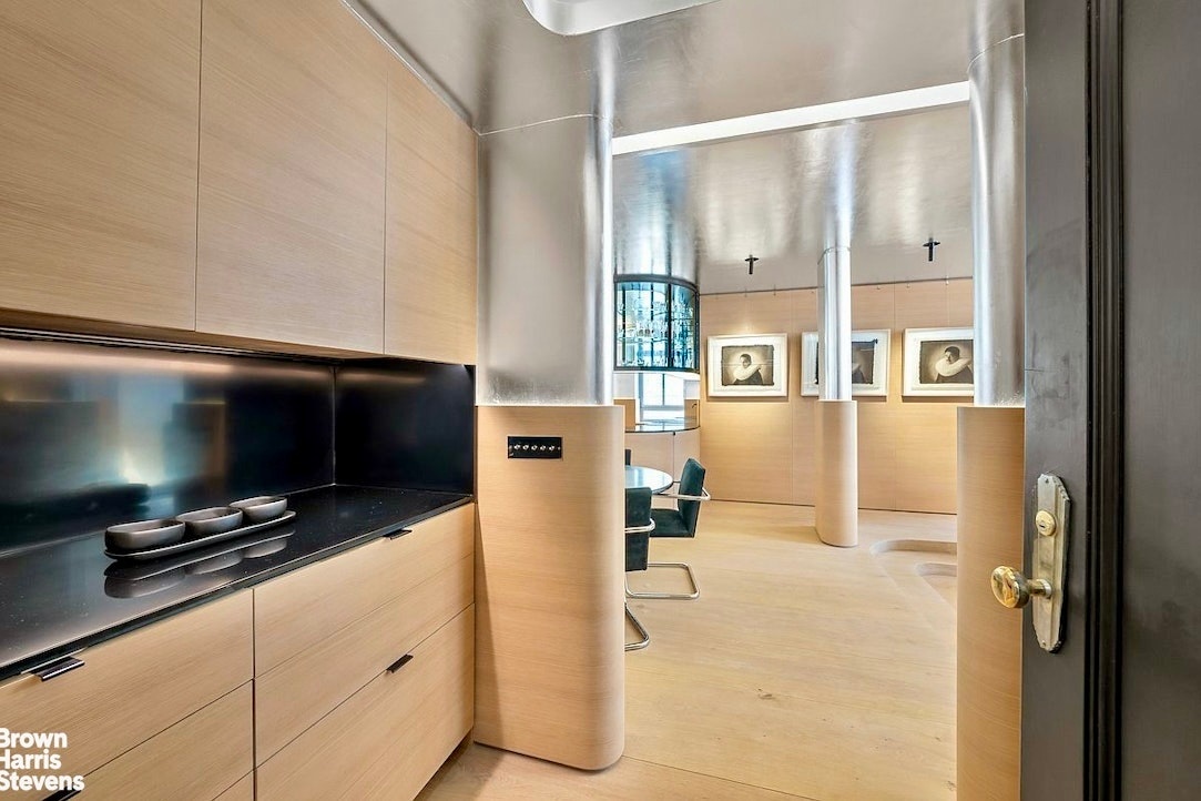 Inspired by the meditative compositions of Rothko and Sugimoto, the apartment's interior unfolds in a serene dialogue of light, texture, and form. Walls were removed to create a fluid expanse where hand-applied silver leaf and European oak define the upper and lower walls of the home-evoking the meeting of earth and sky. Concealed lighting behind oak wainscoting and within ceiling coves bathes the interiors in a soft, ethereal glow.