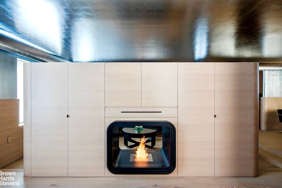 With extraordinary attention to detail, the design expresses fluidity and fine craftsmanship. The absence of right angles, curving walls, and sculptural cabinetry create a sense of seamless motion throughout, highlighted by the incredible curve of the metal and glass kitchen cabinets. In the bathroom, titanium tiles wrap the walls and ceiling, while a Black Corian surface flows continuously from wall to vanity to nightstand. The living room and bedroom share a stunning, ventless curved fireplace that is open to both rooms.