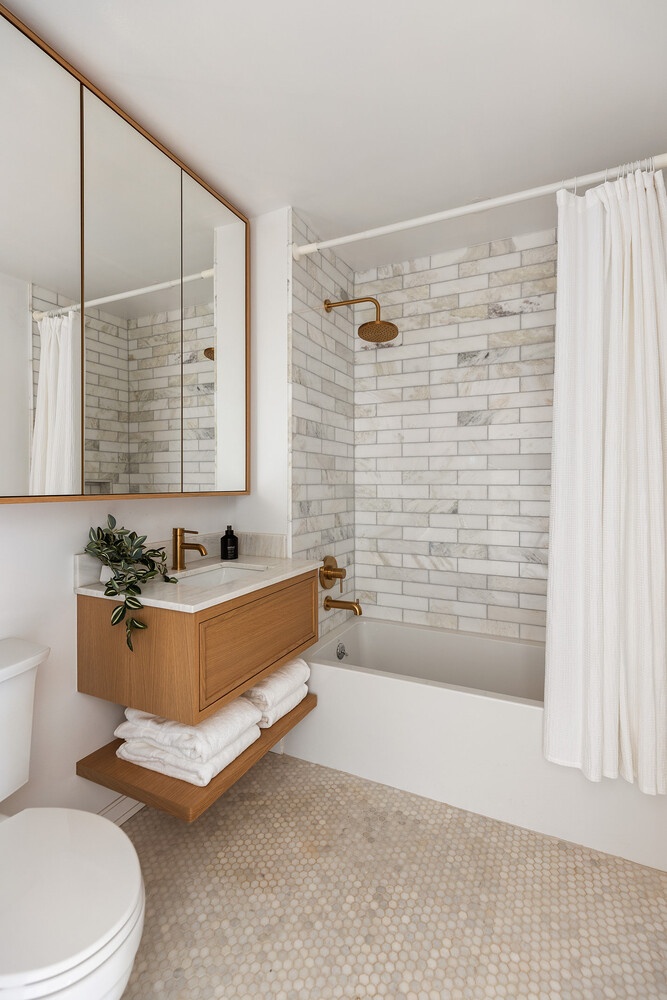 Bedrooms are well-proportioned with generous closet space. Bathrooms are finished with custom white oak vanities, Nestos marble imported from Greece, and refined hardware with mirror storage. The primary bath features Zellige oat ceramic tile and marble flooring, while the secondary bath offers timeless Carrara marble finishes.