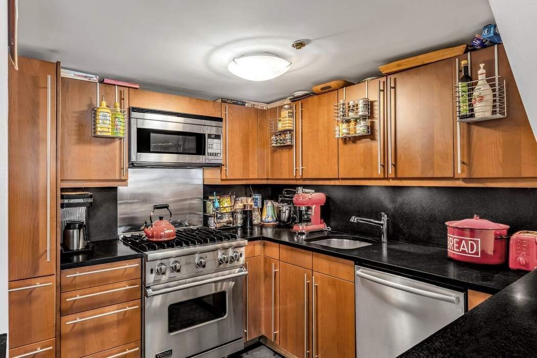 The open kitchen is beautifully appointed with Viking range, Sub-Zero refrigerator, and Poggenpohl cabinetry, complemented by the convenience of an in-unit washer/dryer.