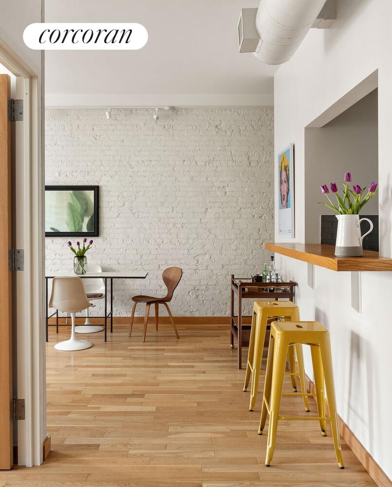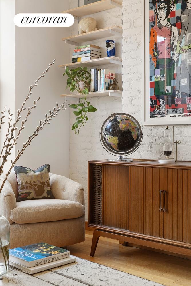 Soaring 10-foot ceilings, and four oversized windows create a bright, airy atmosphere, while the lush, tree-lined street views keep the space feeling fresh and serene. Natural Oak floors run seamlessly throughout the home, creating a sense of warmth and cohesion, while the wall of original exposed brick adds character and charm. The grand, open living room offers generous space for living, dining, and even a home office - ideal for today's busy and flexible lifestyle. The king-sized bedroom has a large closet and offers ample room for a wardrobe, end tables, and more.