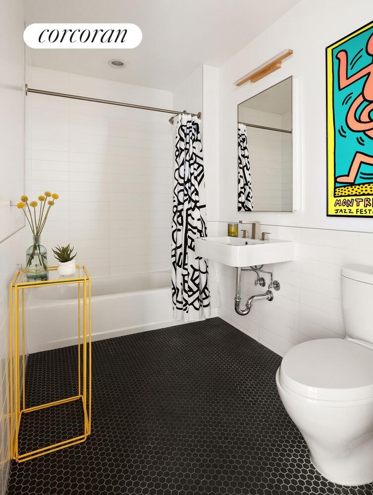 Within the modern kitchen you'll find a sleek stainless steel appliance package, grey quartz countertops with plenty of prep space, ample cabinetry, and even a large pantry ensuring everything has its place. The spacious bathroom features clean, contemporary finishes, including black hexagonal floor tiles, clean, white, large format subway tiles on the walls, and a ceramic bathtub. An in-unit washer/dryer, central heating and A/C, video intercom system, and abundant closet space, keep things comfortable and convenient, adding to the ease of everyday living.