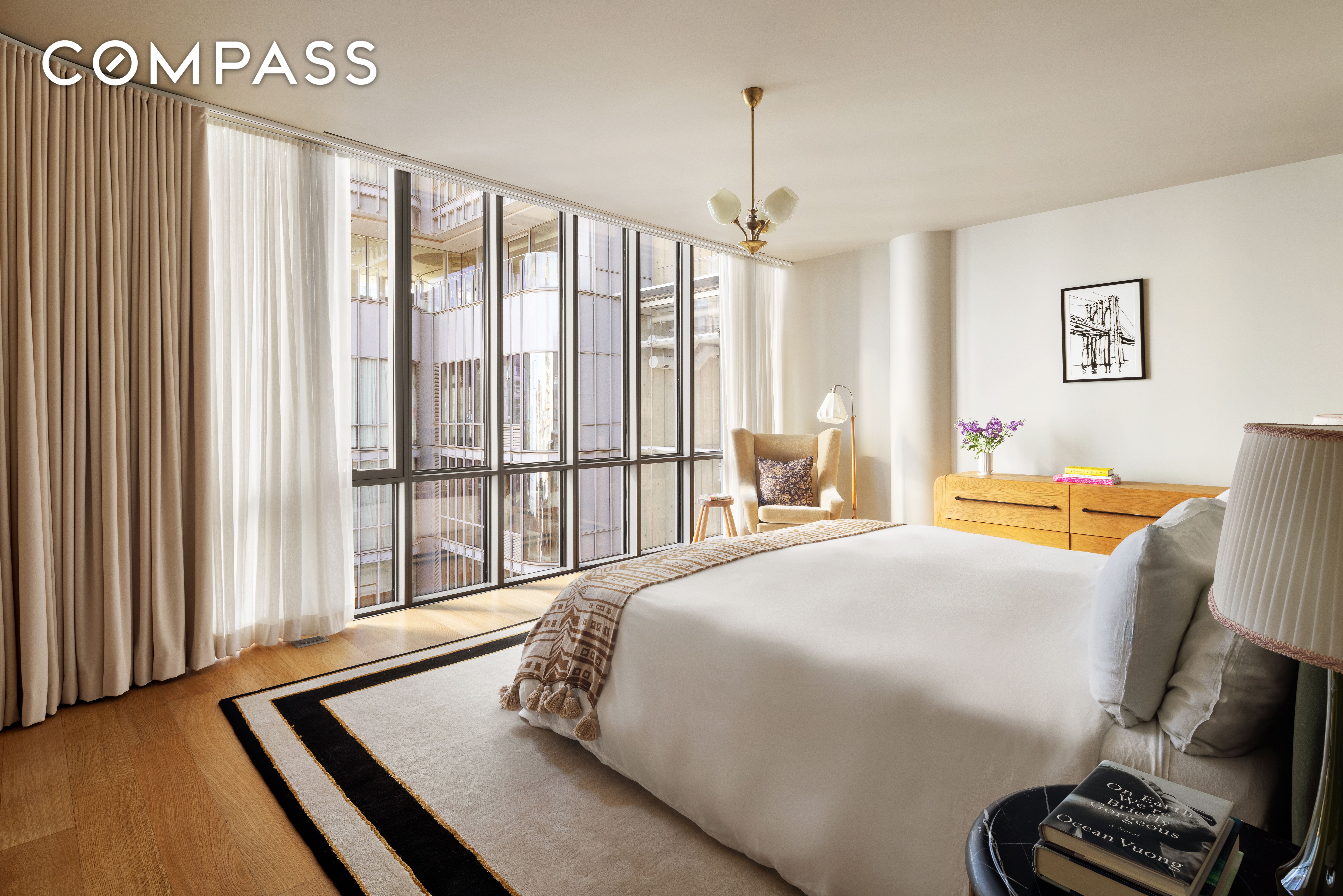 Spanning approximately 2,302 square feet, this expansive 3-bedroom, 3.5-bathroom home is defined by soaring 10-foot ceilings, 6-inch wide-plank white oak floors, and dramatic floor-to-ceiling curved glass that fills the residence with exceptional natural light.