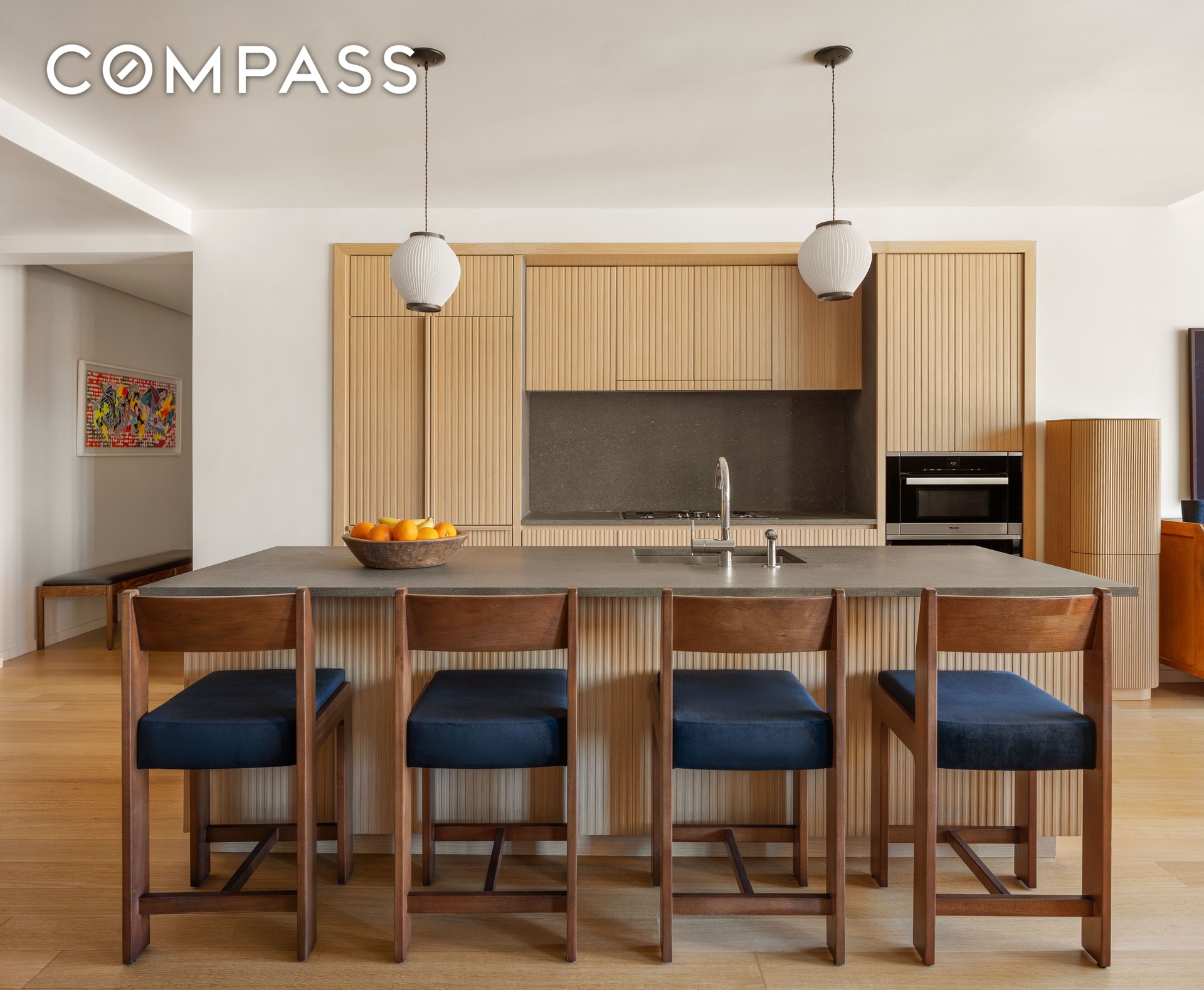 The open chef’s kitchen is thoughtfully designed with custom fluted white oak cabinetry, Balsatina lava stone countertops, and a generous center island, complemented by top-of-the-line Miele appliances including a five-burner gas cooktop, speed oven, wine cooler, and vented hood.