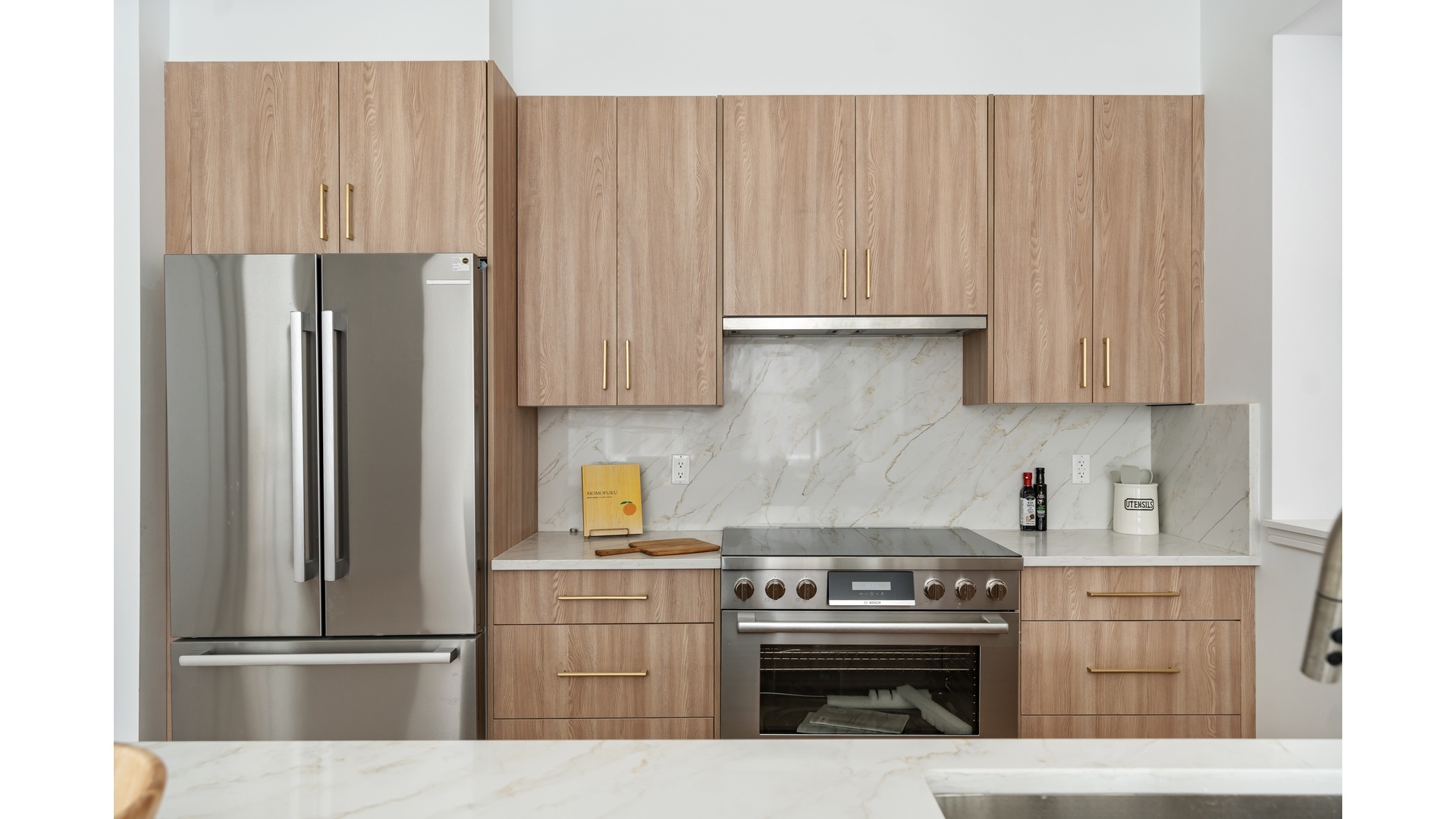 At the heart of each residence lies a chef-inspired kitchen that effortlessly blends beauty with functionality. Aura Gold quartz countertops and a matching backsplash, reminiscent of marble with a delicate palette of caramelized veining against a milky white background, set an elegant foundation. Light wood cabinetry with sandy undertones enhances the space with a bright, airy ambiance, creating a perfect balance of warmth and modern sophistication.