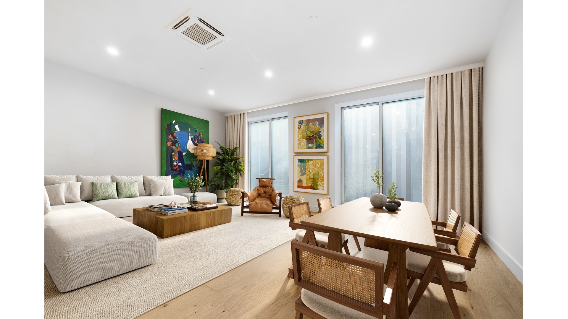 Inside, each home is outfitted with a refined palette of materials that blend modern sophistication with organic warmth. Environmentally conscious wide-plank white oak flooring adds a grounding elegance, while oversized windows and 10ft ceilings that flood the interiors with natural light create a sense of airiness and flow.