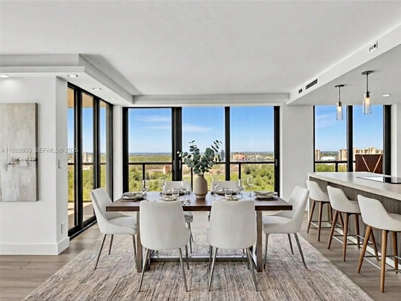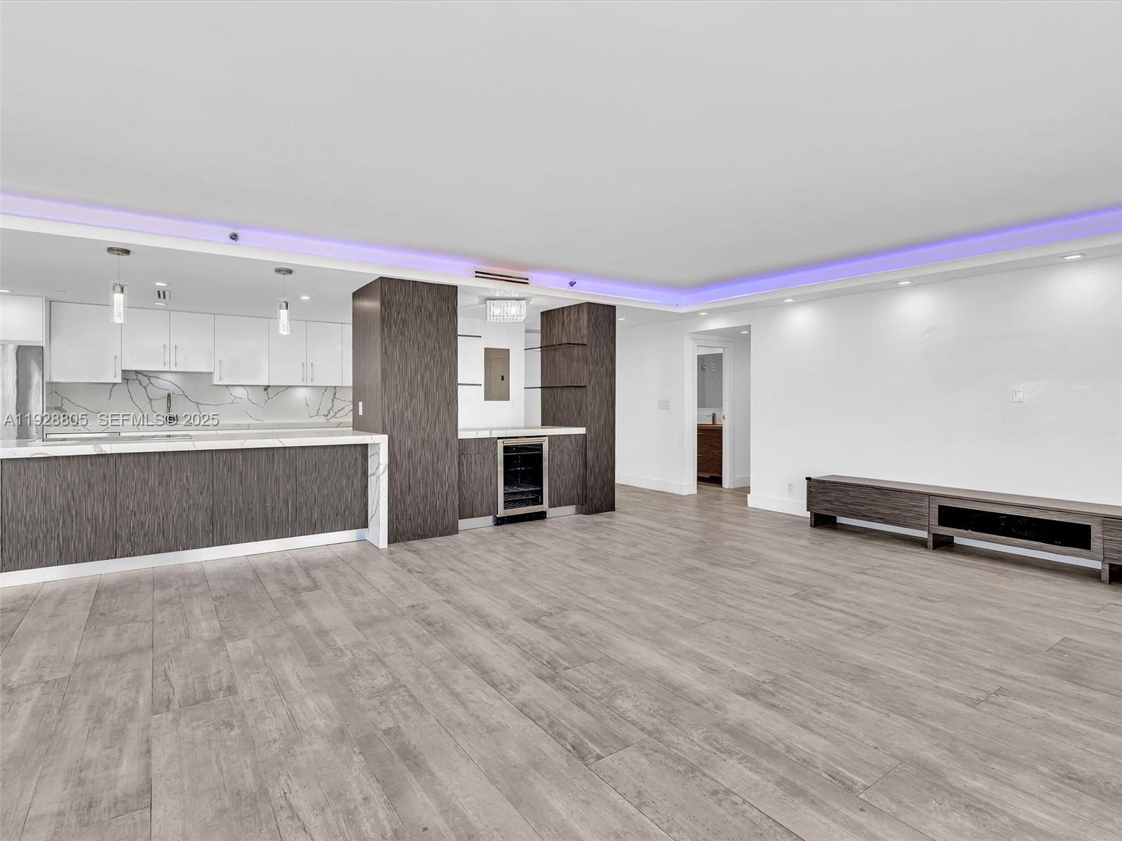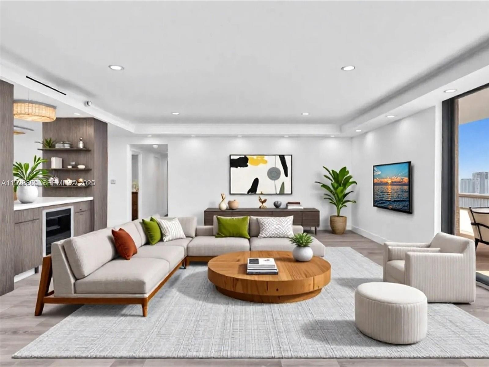 Beautifully renovated and oversized 2-bedroom, 2-bath corner residence with spectacular 360° views from sunrise to sunset. The modern open kitchen features high-gloss cabinetry, premium stainless-steel appliances, quartz waterfall counters, a full-height designer backsplash, home bar with wine cooler, built-in coffee system, and double ovens—perfect for everyday living and entertaining.
