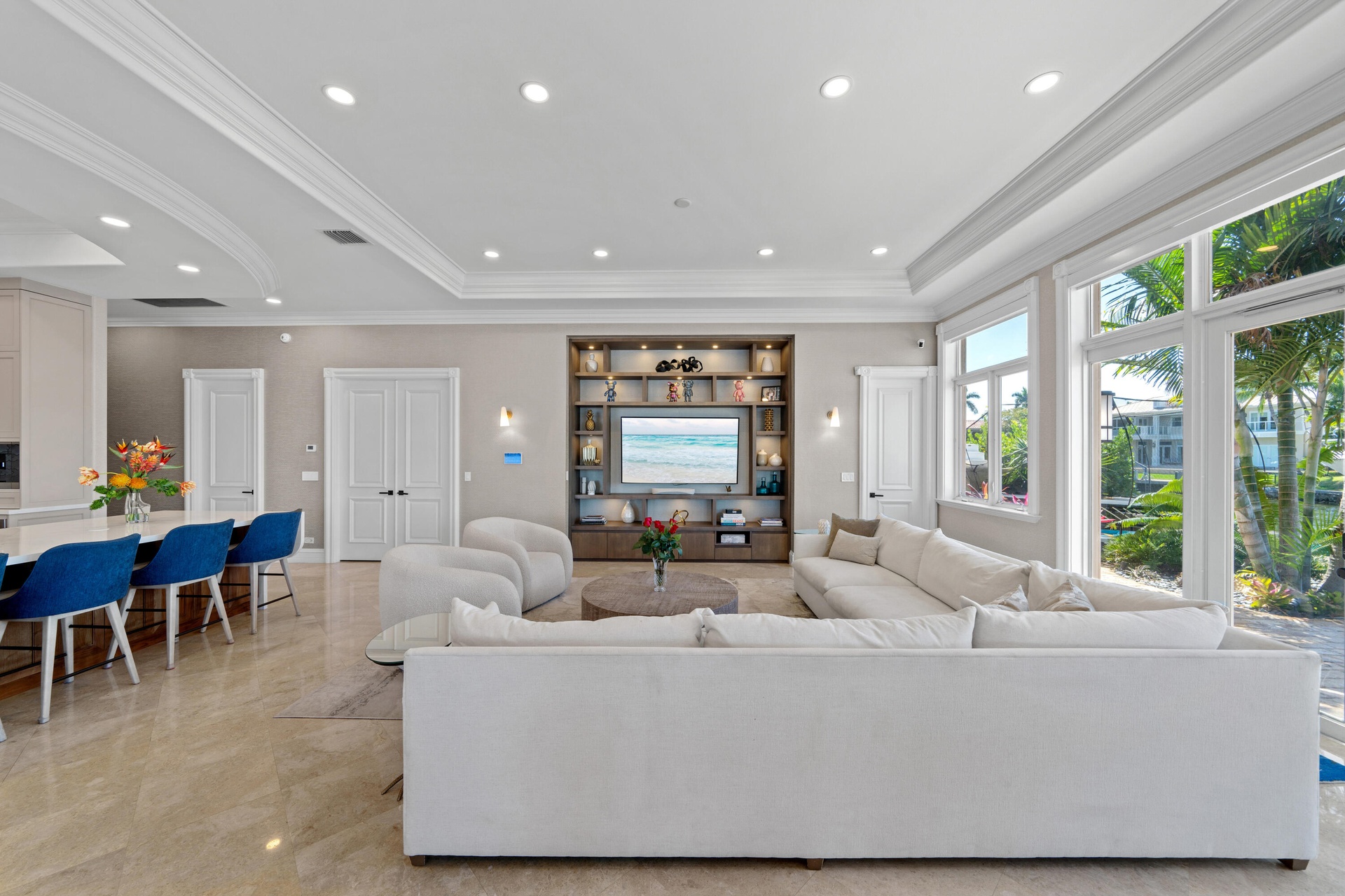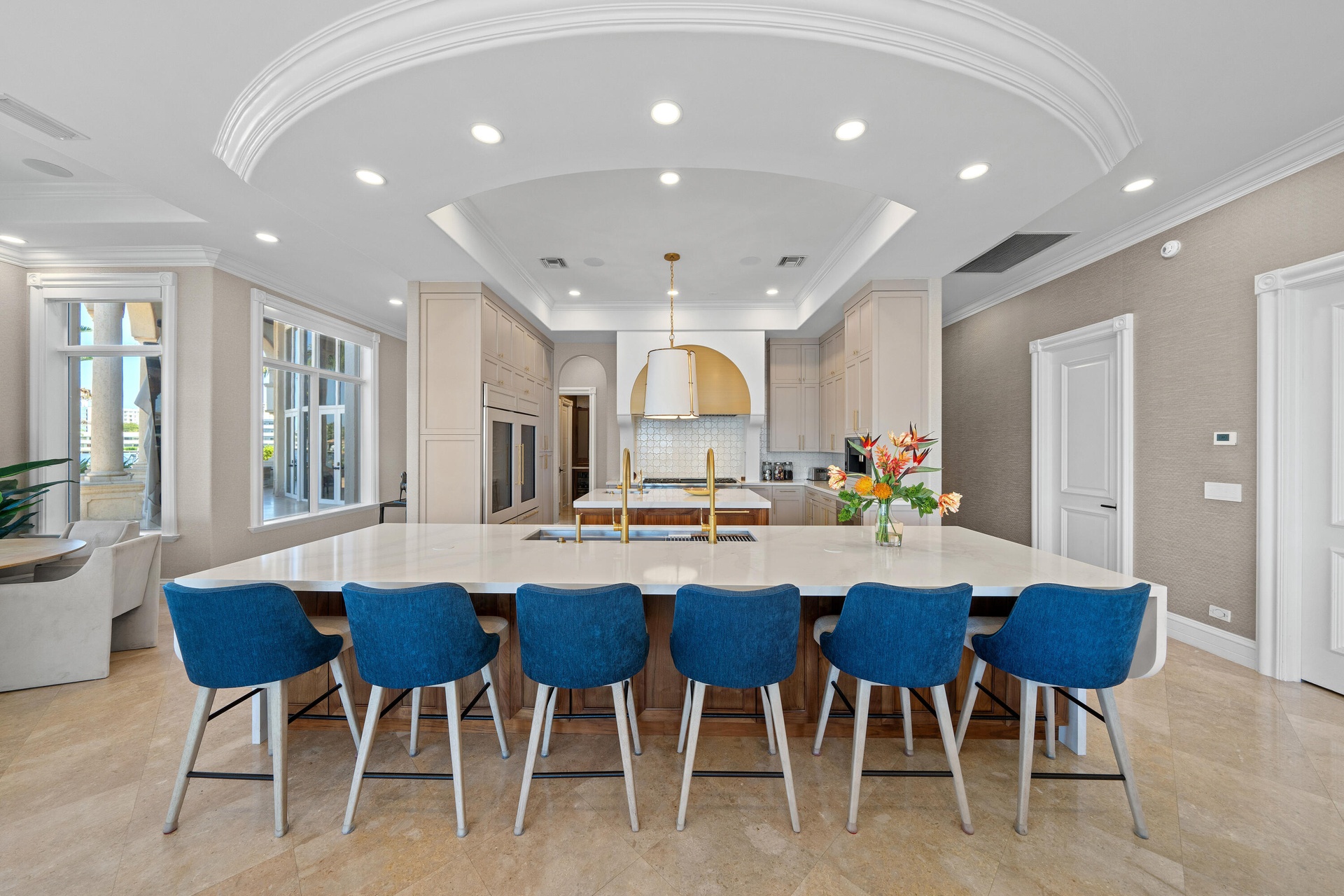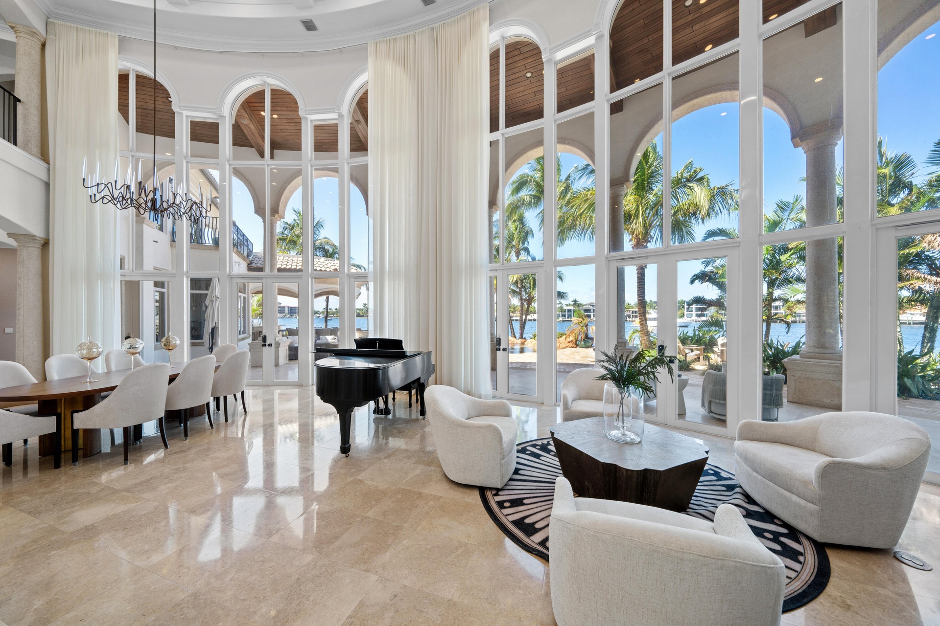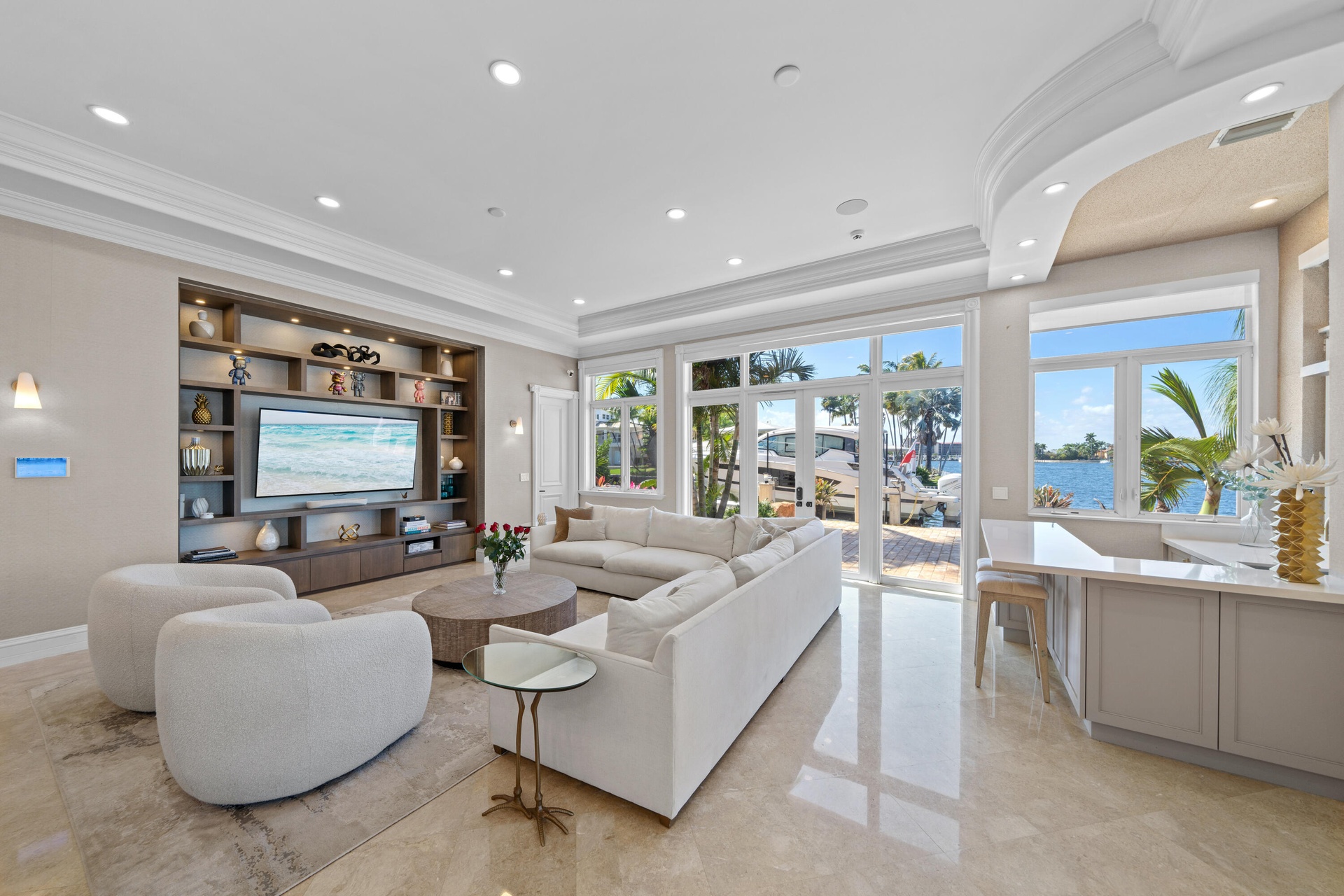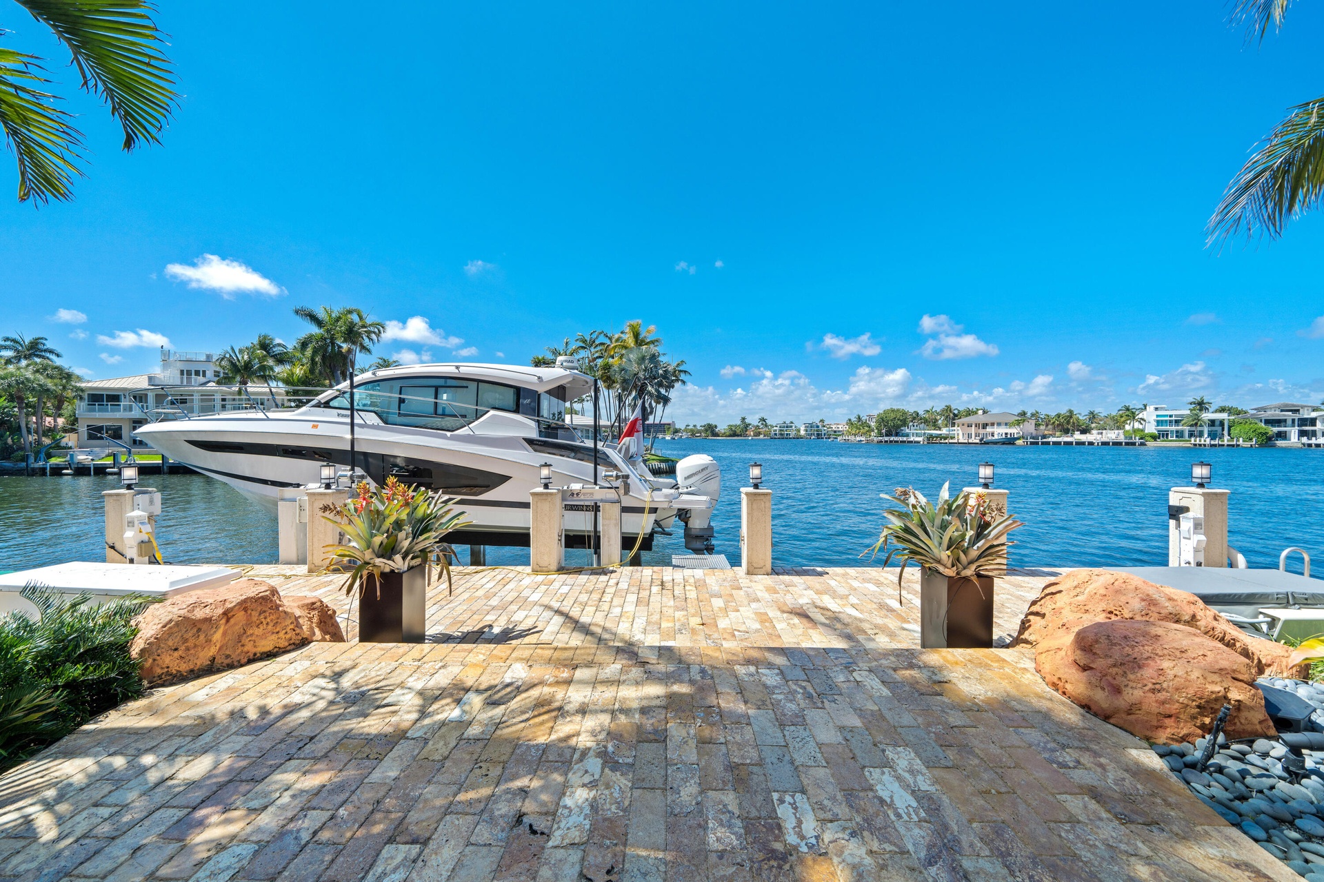 Set on a coveted point lot where the Intracoastal meets Lake Santa Barbara, this exceptional waterfront estate offers over 270 feet of prime dockage, accommodating multiple large vessels with ease.