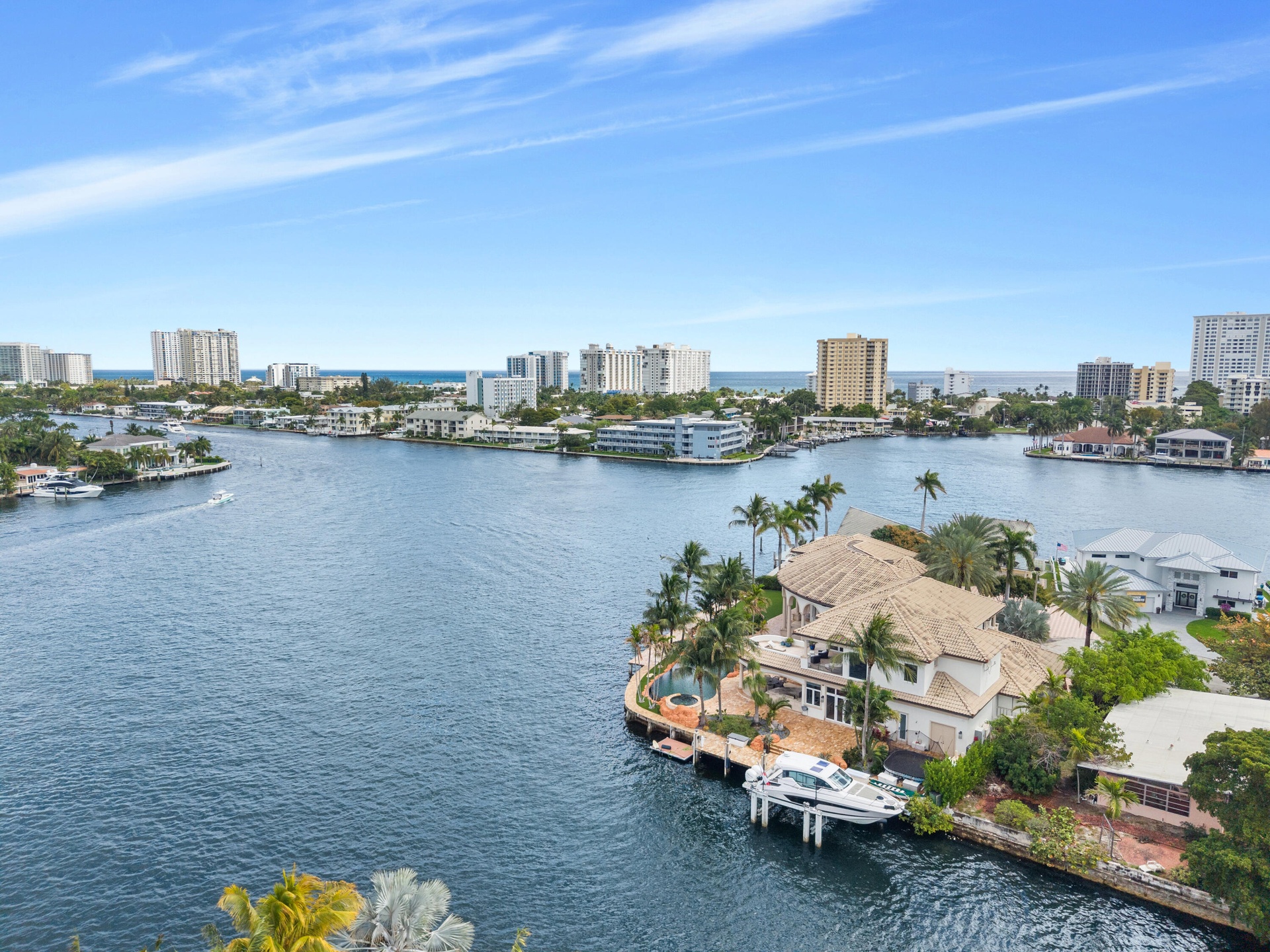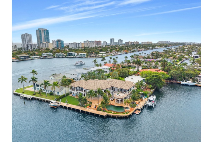 Set on a coveted point lot where the Intracoastal meets Lake Santa Barbara, this exceptional waterfront estate offers over 270 feet of prime dockage, accommodating multiple large vessels with ease. Sweeping wide-water views create a spectacular backdrop of sunrises, sunsets, and passing yachts. The residence is fully renovated and shows impeccably, blending luxury with functionality. Features include an elevator, gym, office, movie theater, and full home automation. A five-car garage with the ability to add lifts provides ample space for car enthusiasts. Offered furnished or unfurnished, this turnkey property delivers the ultimate South Florida waterfront lifestyle just minutes from the beach and top dining. Rare point lot with over 270 feet of waterfront offering exceptional dockage for multiple large vessels with direct ocean access and no fixed bridges. Positioned at the junction of the Intracoastal and Lake Santa Barbara, the property enjoys some of the most expansive water views in the area. Fully renovated residence with elevator, gym, office, and private theater, designed for both luxury living and entertaining. Five-car garage with the ability to add lifts for additional capacity. Full home automation throughout. Offered furnished or unfurnished for immediate enjoyment. Ideal as a primary residence, seasonal retreat, or trophy waterfront investment.