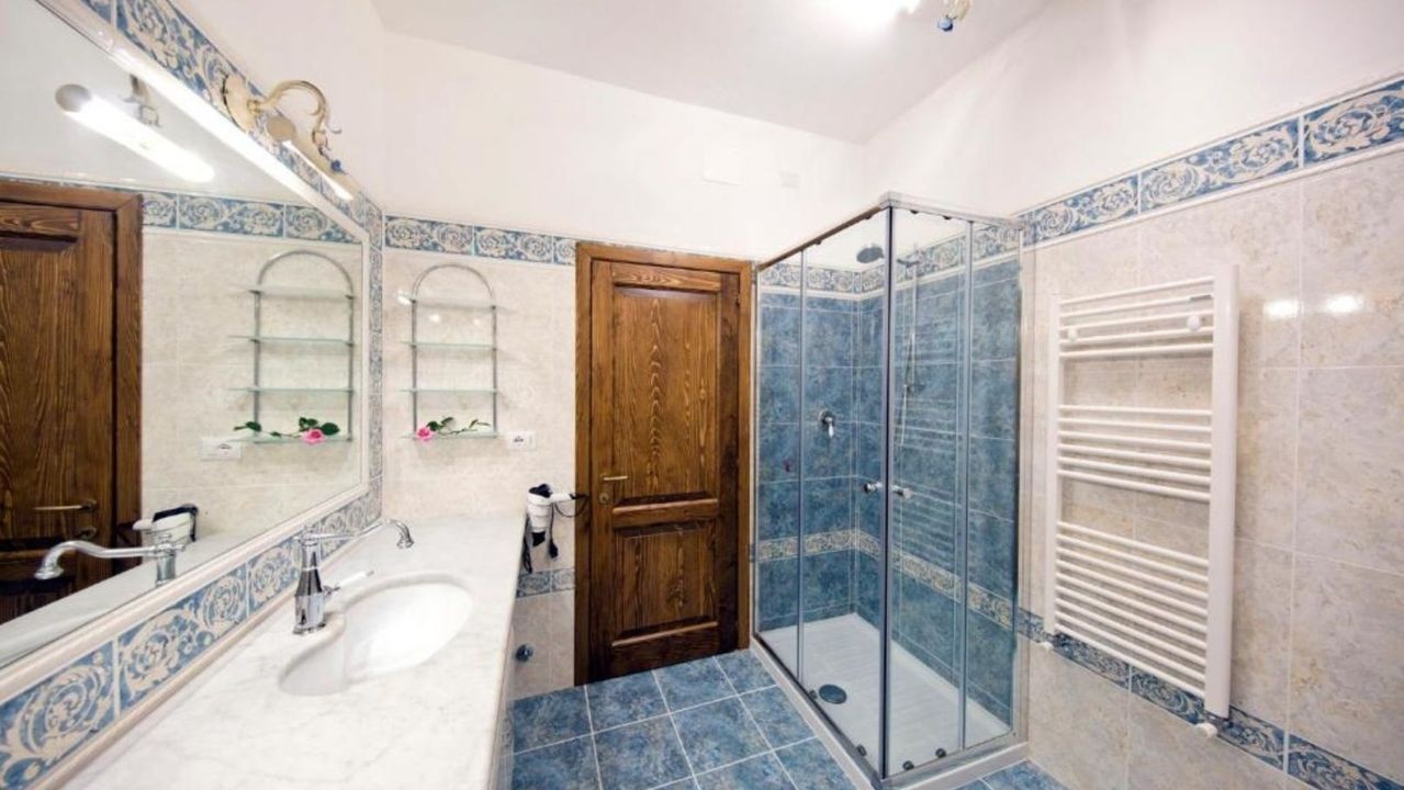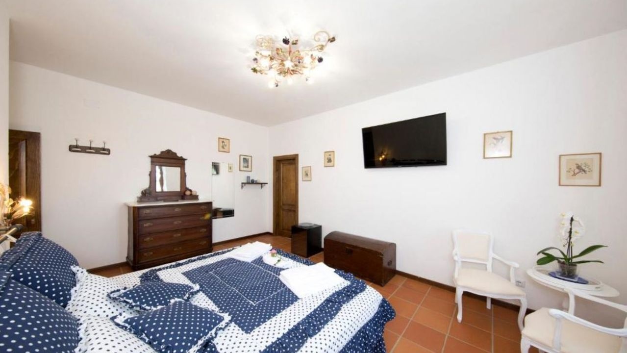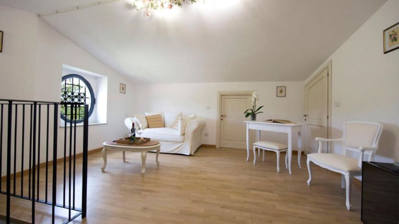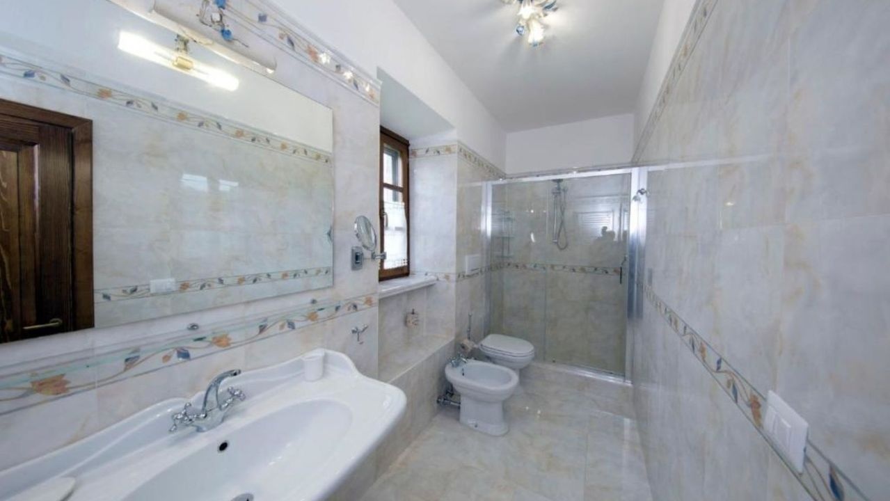 The first floor houses a TV room and four double bedrooms with private bathrooms, some connected to attics used as wardrobes. Outside, an elegant 45 sqm porch completes the main building, alongside the technical room with a latest-generation pellet boiler.