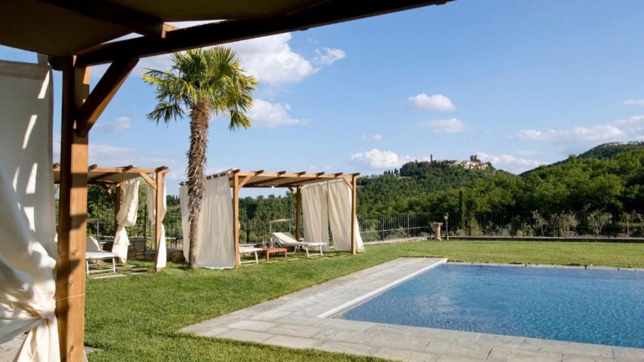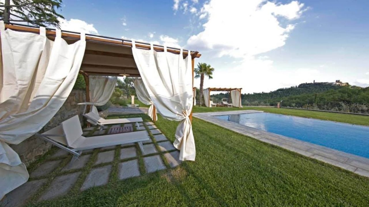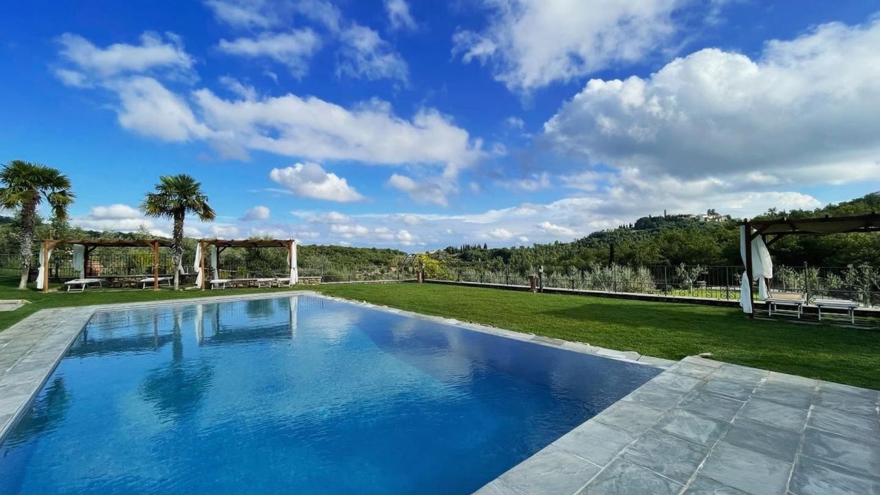 The annex, of about 82 sqm, consists of two wings connected by a solar greenhouse and offers three en-suite bedrooms, a laundry room, and a private porch. Near the panoramic swimming pool, there are technical rooms and changing rooms for guests.