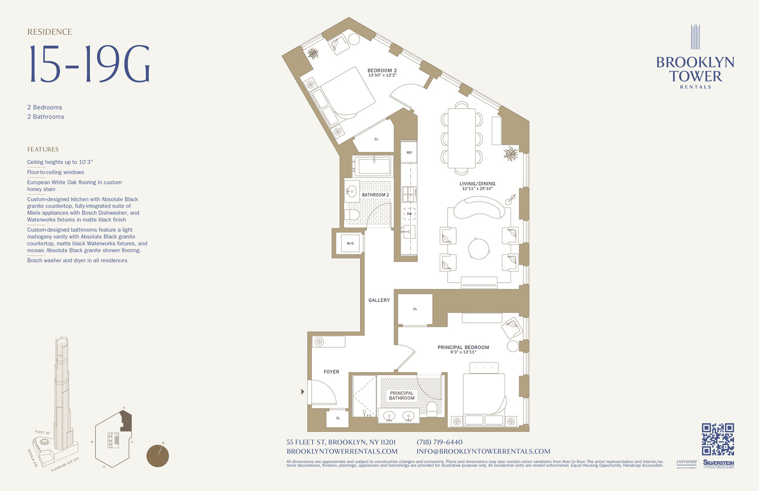 Rental residence 17G is a breathtaking 2bdrm layout featuring 10' lofty ceilings and full height windows which flank the open space offering an unparalleled eastern exposure of The Brooklyn landscape and Fort Greene Park. European white oak flooring in custom honey stain align the residence creating and indulgent warmth.