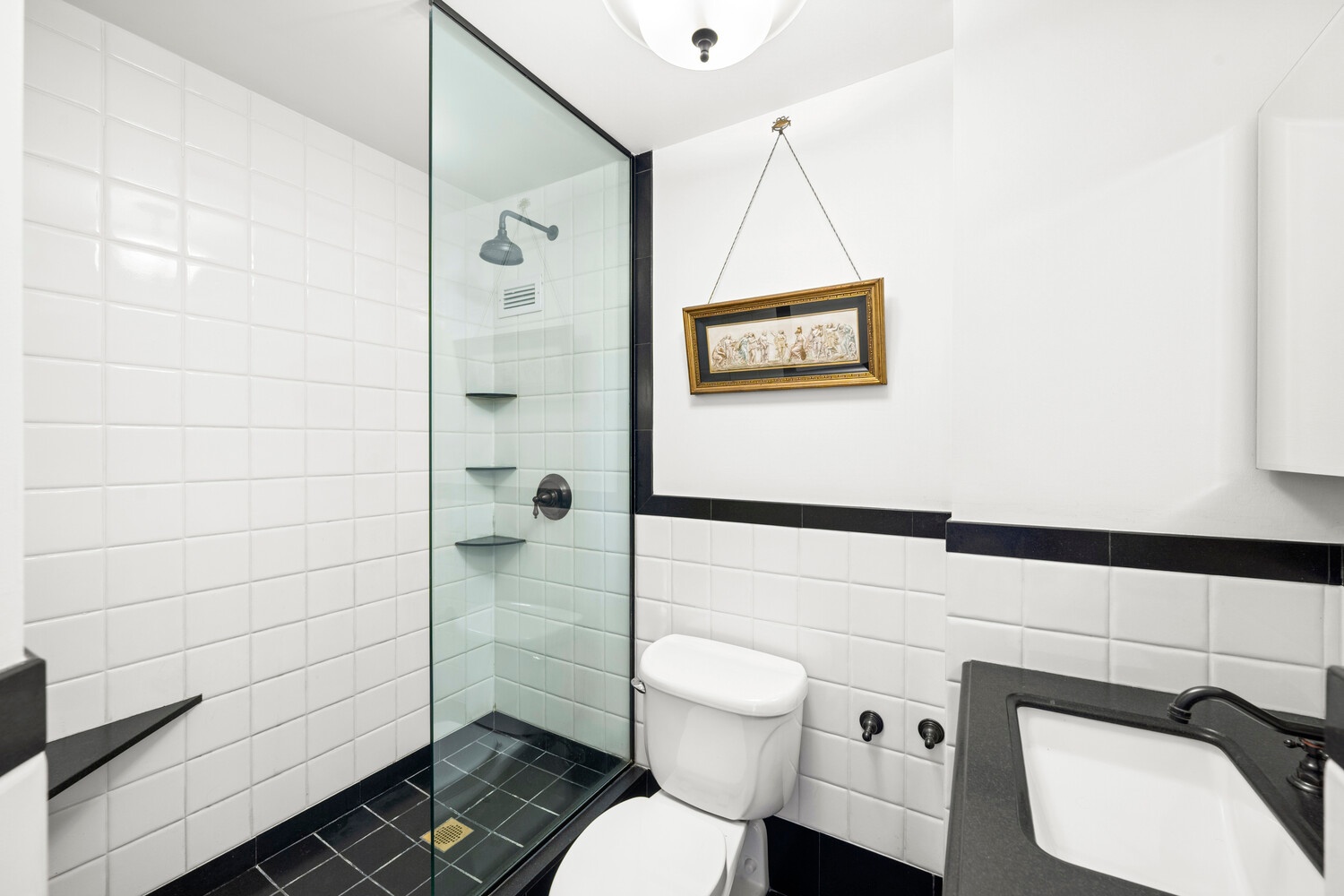 Step into a light-filled living space that instantly feels like home. You'll be greeted by an abundance of natural light coming from a wall of oversized windows and the soaring 14' ceilings. The windowed kitchen features custom cabinetry and ample counter space for all your culinary adventures. The bedroom is a peaceful retreat, offering a generous layout and plenty of storage. The bathroom, equipped with vintage fixtures is all-clad in New York classic glossy black and white tiles, providing a serene space to unwind at the end of the day.