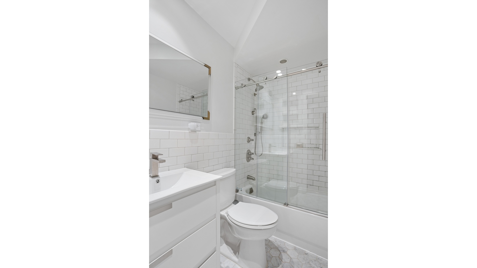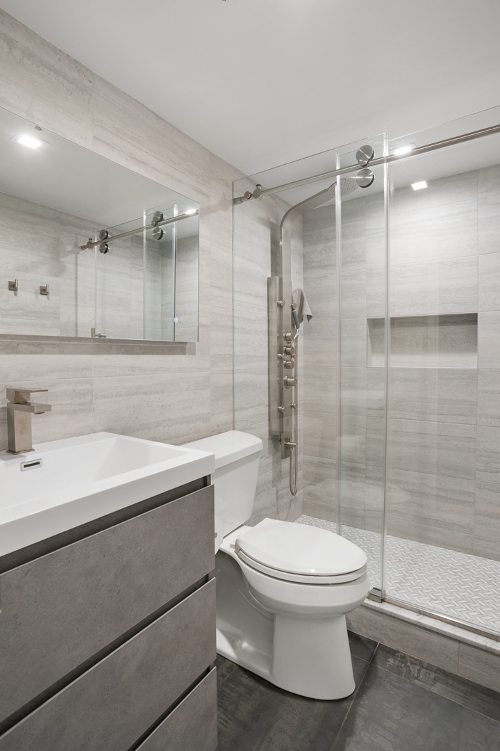 The recently renovated kitchen is equipped with premium appliances including a Viking range and vented hood, combining modern design with excellent functionality. Bathrooms have also been tastefully updated, including a beautifully appointed spa-inspired bath featuring a glass-enclosed shower and separate soaking tub that provides a calming, residential feel rarely found in comparable Village properties.
