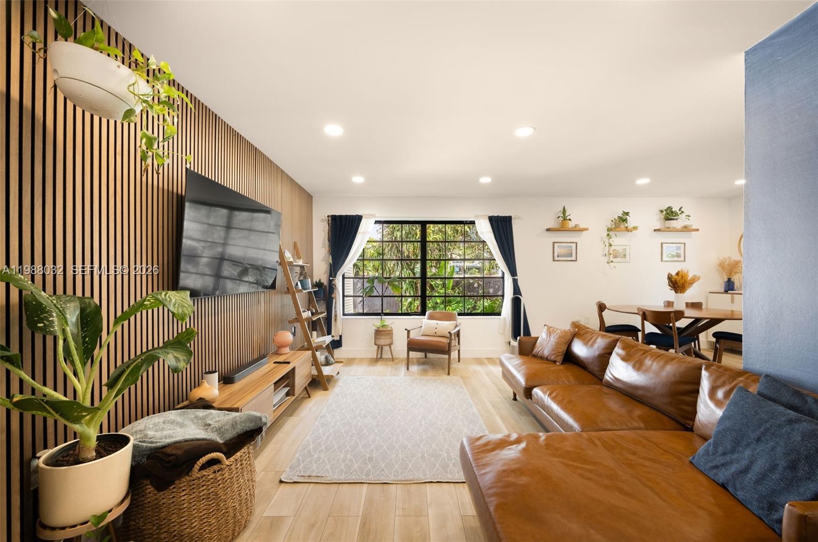 Updated 4-bedroom, 2-bath home in sought-after Palmetto Estates, featuring bright, inviting living spaces and stylish upgrades throughout. The home offers a modern white kitchen with granite countertops, stainless steel appliances, custom wall paneling, and smart WiFi-enabled lighting for added convenience and ambiance.