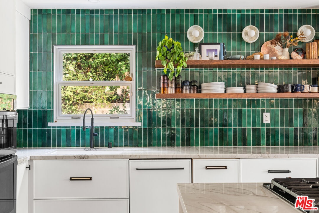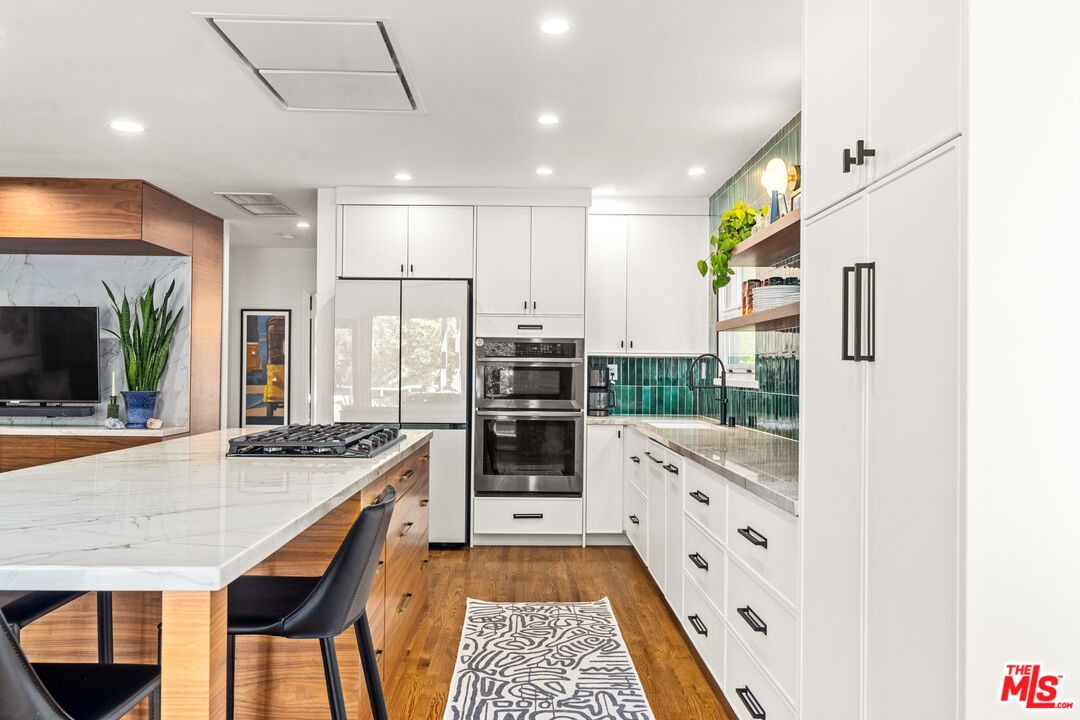Nestled at the end of a quiet, non-through street and surrounded by lush greenery, this 1,978-square-foot, three-bedroom, three-bathroom home offers a rare sense of privacy paired with effortless indoor-outdoor living. Beautifully upgraded with designer finishes throughout, this charming retreat offers an abundance of natural light, with space to entertain on all scales. At the heart of the home, an open concept living and dining area flow seamlessly into the gourmet kitchen - complete with a large center island with breakfast bar, and professional-grade appliances. Dramatic emerald ceramic tile, bespoke marble surfaces and custom walnut cabinetry further enhance the space, which opens directly to an oversized outdoor terrace - perfect for alfresco dining. Three-bedroom suites consist of a lower-level primary, complete with sumptuous en-suite bathroom, large walk-in closet and sliding doors that open to a private covered patio, and the charming back yard with lush, mature landscaping. Two guest bedrooms share an outdoor terrace with views of the back garden, with an additional two designer-guest bathrooms for added convenience. A finished two car garage and ground floor storage room complete the home. This is a prime opportunity to own a turn-key property in the heart of Bel Air - moments from the best dining, leisure and transportation links Los Angeles has to offer.