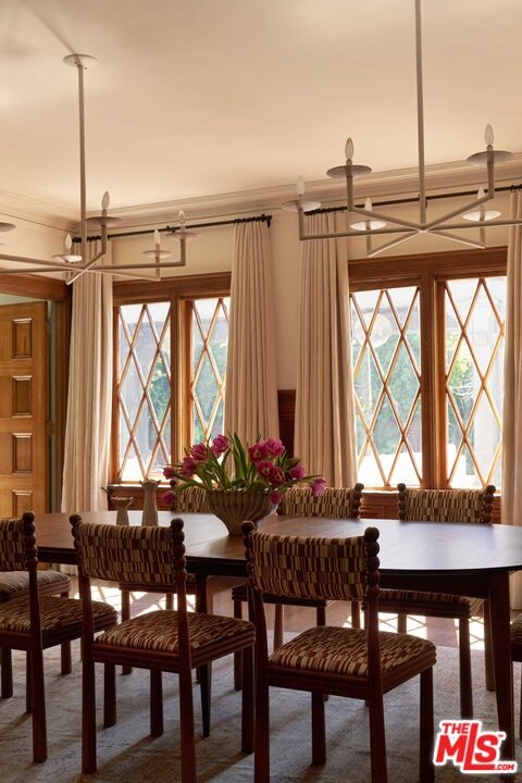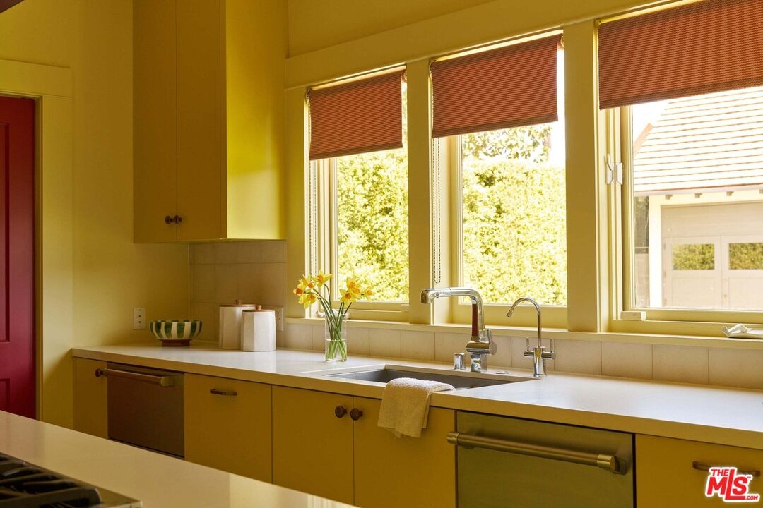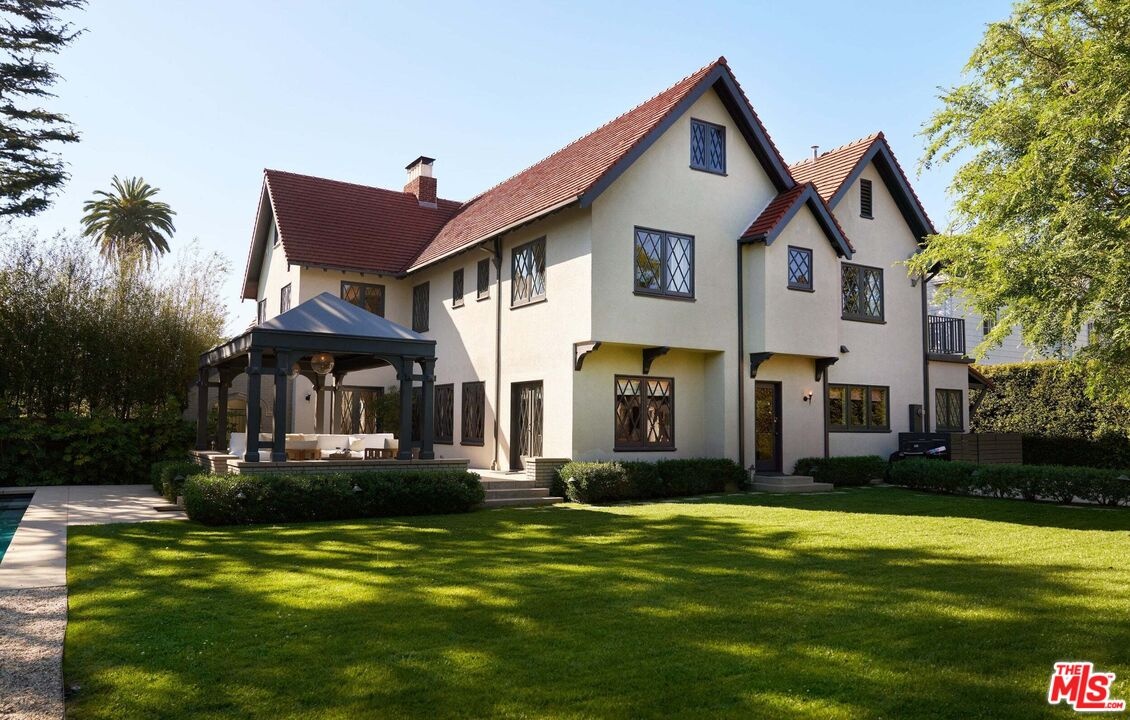 Stately and enduring, this Windsor Square English residence sits on an expansive flat lot, blending architectural pedigree with thoughtful, design-forward updates. Originally built by Meyer & Holler, known for iconic landmarks such as the Chinese and Egyptian Theatres, the home has been meticulously restored and refined by June Street Architecture, preserving its historic integrity while elevating it for modern living. A grand gated entry sets the tone, unfolding into a formal living room anchored by a fireplace, and a separate den with its own fireplace, an intimate retreat layered with warmth and character. The formal dining room connects to a well-appointed kitchen and sunlit breakfast room, with adjacent laundry and two conveniently placed powder rooms. Upstairs, a flexible and generous layout offers three secondary bedrooms alongside an extraordinary primary suite, complete with a large walk-in closet, dual baths, and a dedicated office that easily functions as an additional bedroom. The scale throughout is both impressive and livable, with beautifully preserved windows, doors, and woodwork that speak to the home's craftsmanship and history. Outside, the grounds unfold like a private park: lush, expansive, and designed for both entertaining and retreat. A pool and gazebo are set within the verdant backyard, while a detached garage offers versatile use as a gym, screening room, or creative studio. A separate guest suite provides additional flexibility for visitors or extended stays. A rare offering of scale, provenance, and enduring beauty, and just moments from the shops and restaurants of Larchmont Boulevard, this house checks every box.