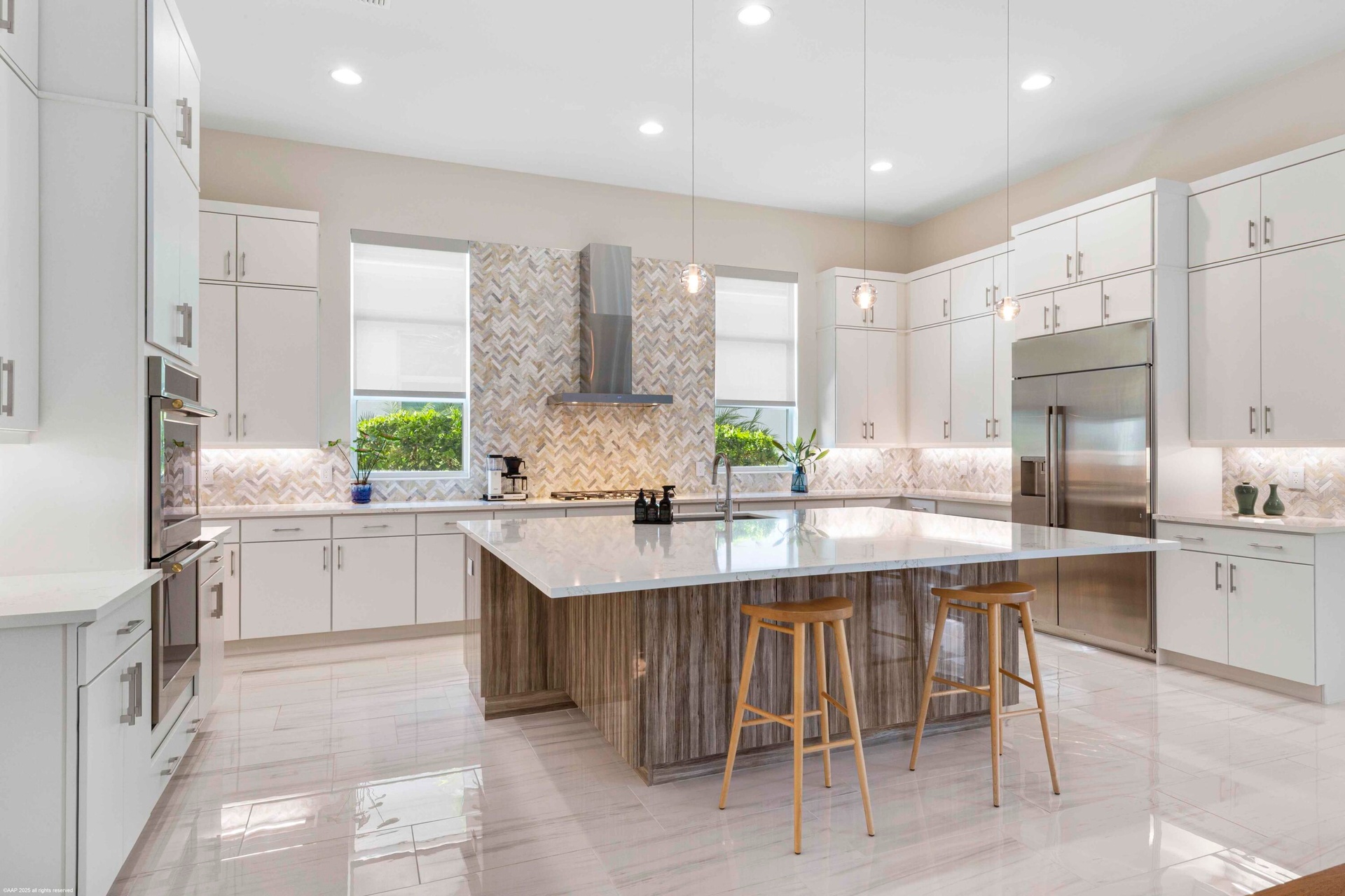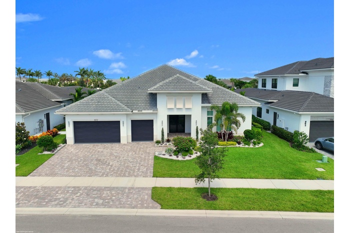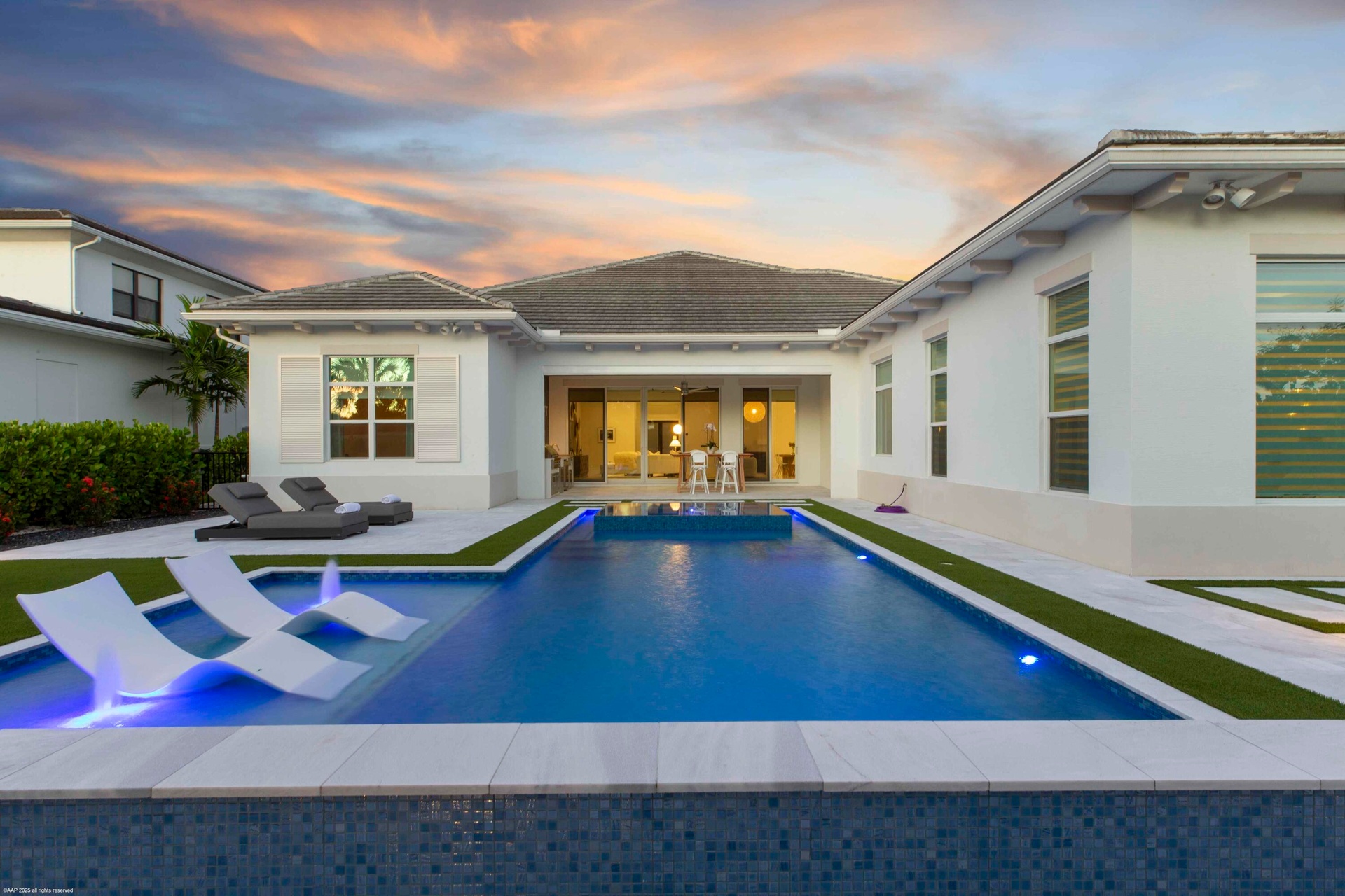 Experience refined Florida living in this exquisite 5-bedroom, 4.5-bathroom Barbados V estate home by Kenco, perfectly positioned in one of Palm Beach Gardens' newest gated communities- Coral Isles at Avenir. Designed for both elegance and comfort, this single-story home offers exceptional craftsmanship, a thoughtful open-concept layout, and an outdoor oasis that rivals any resort. From the moment you arrive, the home's striking curb appeal sets the tone. A paver driveway leads to the spacious 3-car garage, while lush tropical landscaping, enhanced by professional landscape lighting, welcomes you to the front entry with brand new impact rated, double front doors. Inside, soaring ceilings, expansive windows with electronic shades, Lutron lighting, & designer finishes create an inviting atmosphere.
