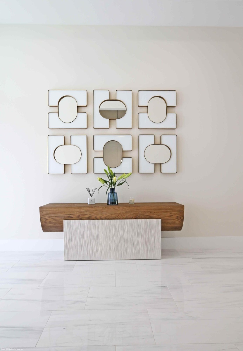 The heart of the home is an expansive great room seamlessly connecting the living, dining, and kitchen spaces; perfect for entertaining or relaxing with family. Walls of glass frame views of the custom pool and outdoor living area, blurring the line between indoor and outdoor spaces. The gourmet chef's kitchen features top-of-the-line appliances, a large center island with seating, custom cabinetry, and sleek quartz countertops. The adjacent dining area and living room, with elegant lighting and designer details, ensure every gathering feels special.