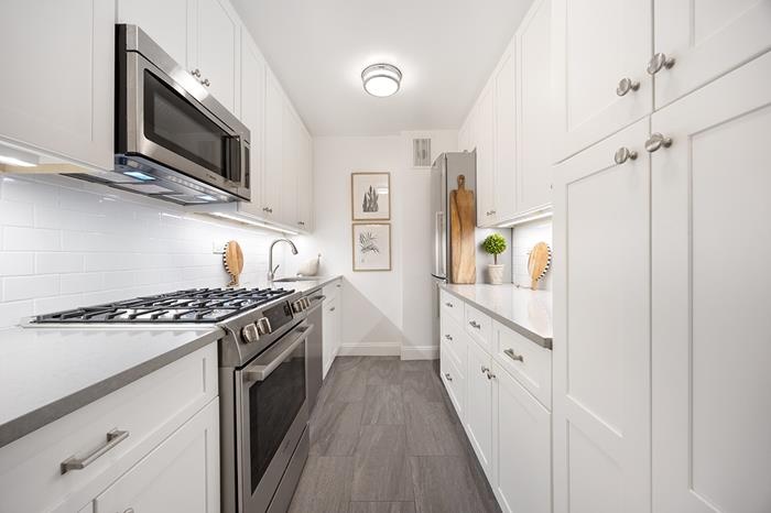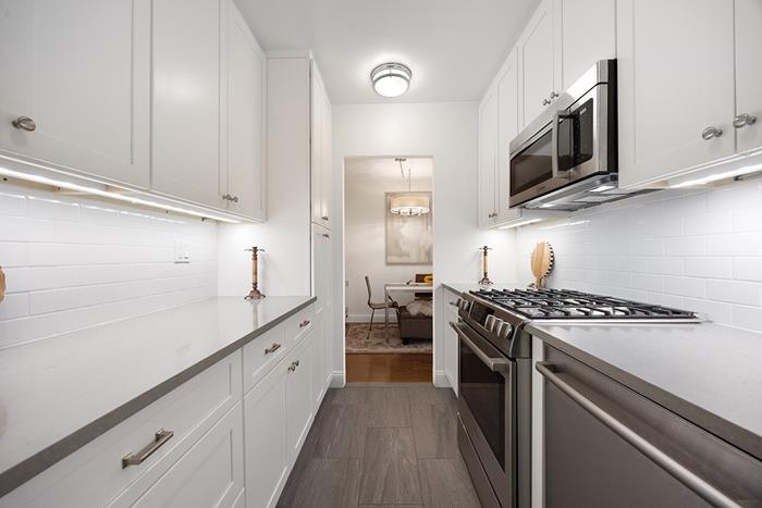 . A FULLY RENOVATED and EXPANDED STAINLESS STEEL KITCHEN providing Abundant Countertop Space and Pantry Storage with Double Utility Closet, Granite Countertops, Bosch Appliances (including 5-burner Range), Porcelain Floors, Under-the-Counter Lighting and Two Overhead Light Fixtures.
