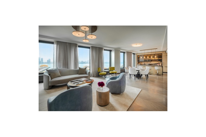 Designed by Thomas Juul-Hansen, Residence 6 features exquisite furnishings by Giorgetti, hand-laid oak and walnut floors, and custom Alabaster light fixtures. With its open concept design and oversized 8-foot picture windows, this light-filled residence offers generous living and entertaining areas and a dining area that can comfortably seat eight guests. The custom-designed marble kitchen is equipped with a top-of-the-line Miele and Sub-Zero Wolf appliance suite, including a refrigerator, dishwasher, oven, and wine refrigerator. Luxurious details include a Giobagnara leather Nespresso machine, Christofle and Bernardaud tableware, as well as a curated private bar.
