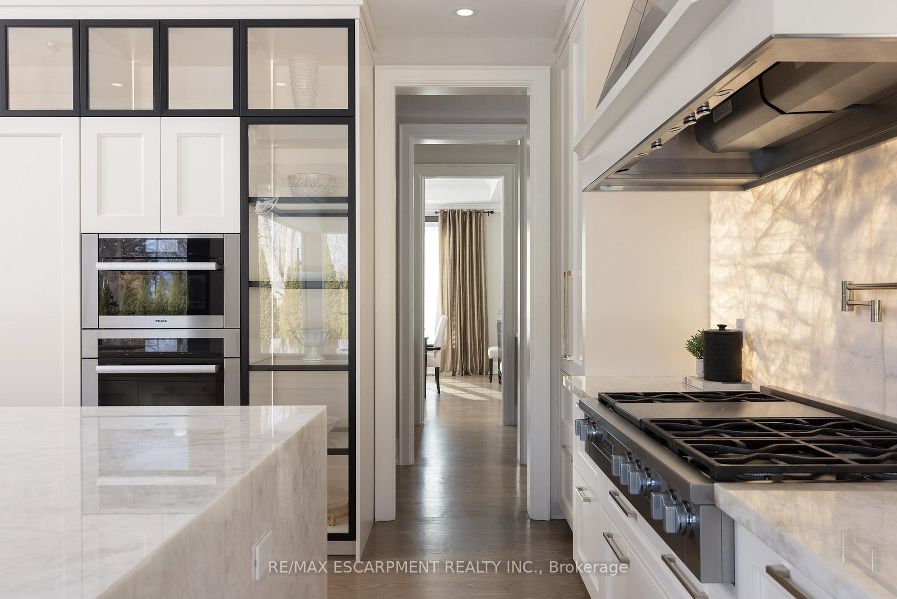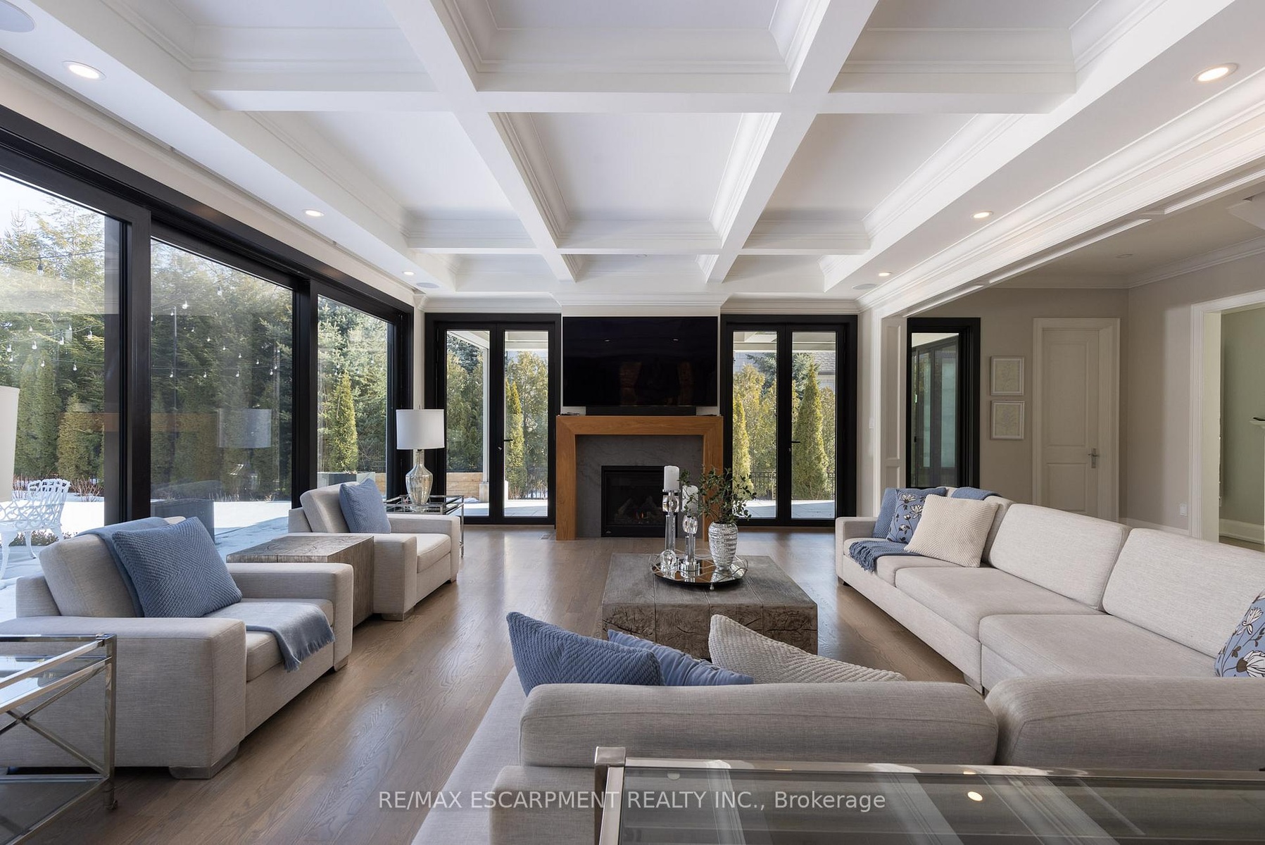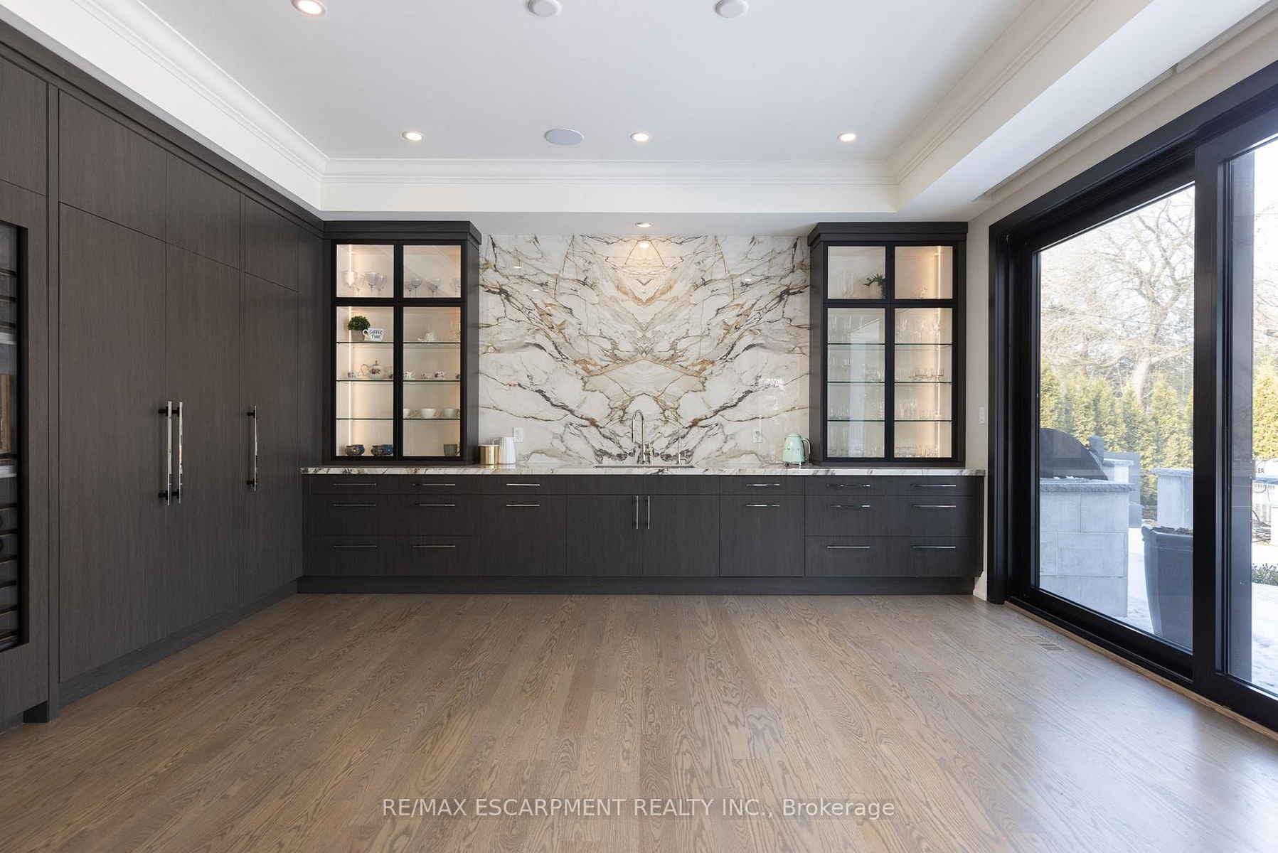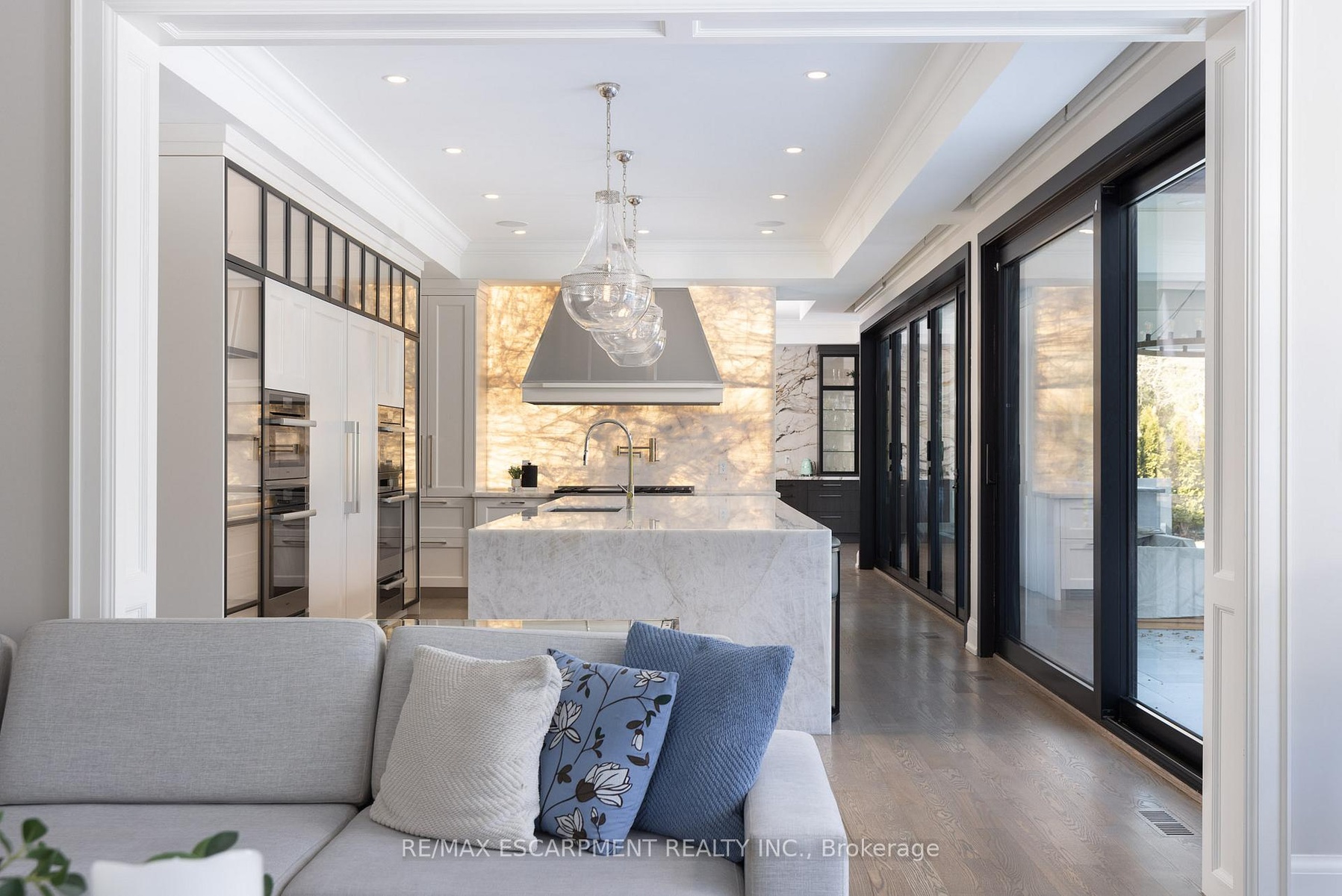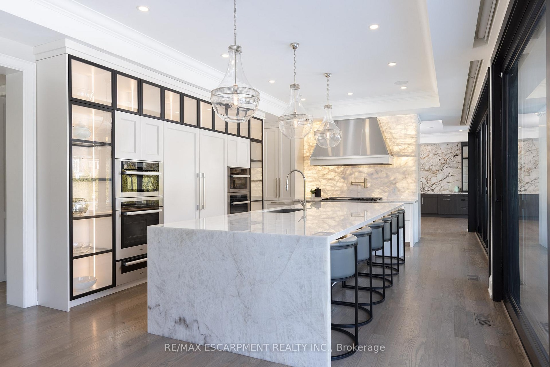 Located on the prestigious private lane of Lambert Common this masterful 8300 square foot plus home includes a seamless 2024 addition from the original 7 year old build. This custom residential design stuns with grand proportions and meticulous detail. All three levels feature 10-foot ceilings defining the home by its impressive rooms and an atmosphere of space and luxury. The entrance is both welcoming and breathtaking with it's incredible moldings and crystal chandelier casting diamond glints across the foyer flanked by the living and dining rooms. Stepping through to the back of the house, you will be dazzled by the panoramic views of wall to wall glass overlooking the two heated patios. The culinary wing is divided into two distinct zones for the ultimate hosting experience: The Showcase Kitchen: A visual centerpiece featuring a dramatic backlit stone wall that serves as a piece of living art. A 14-foot island, elegantly underlit to create a feeling of light providing sophisticated seating for six to enjoy the stunning kitchen. The Prep Kitchen: Positioned discreetly at the back of the main floor, this secondary kitchen allows for preparation to remain out of sight, ensuring the primary living space remains pristine. The home boasts five bedrooms with walk-in closets and ensuites. The Primary Suite is a dedicated sanctuary with his & hers walk-in closets, fireplace, and private bath, all oriented specifically to provide a serene, view of the lake, allowing the water to serve as a constant, tranquil backdrop. The upper level laundry room is spectacular an appliance package that includes a steam closet. The Entertainment & Wellness Lower Level Maintaining the same 10-foot ceiling height as the upper floors, the lower level is a destination unto itself. This level is fully equipped for a high-performance lifestyle, featuring and private glass enclosed gym, theatre room, open recreation room, secondary laundry suite and sixth bedroom with private office.