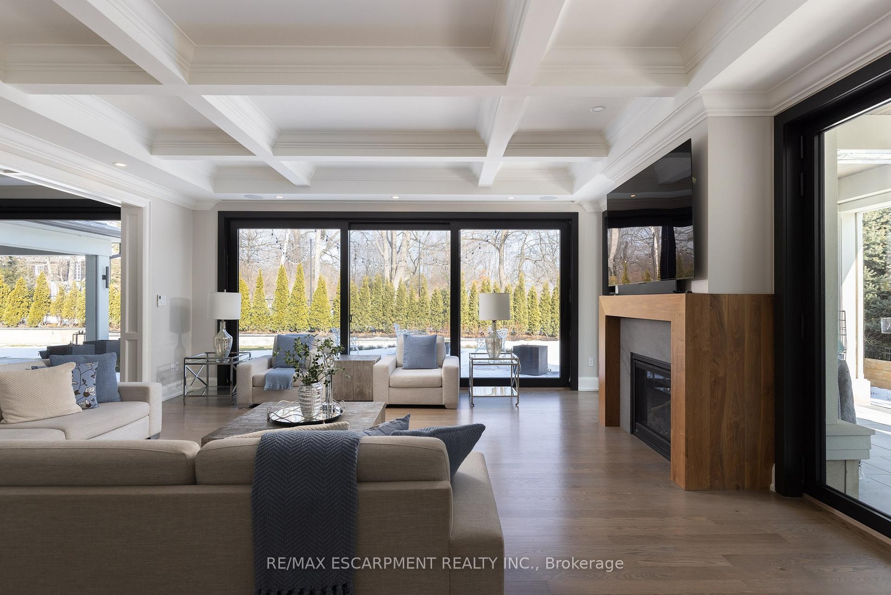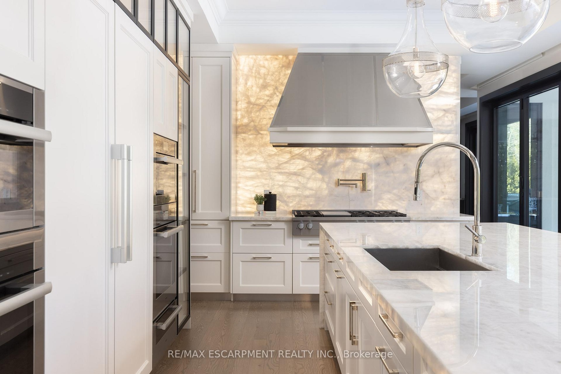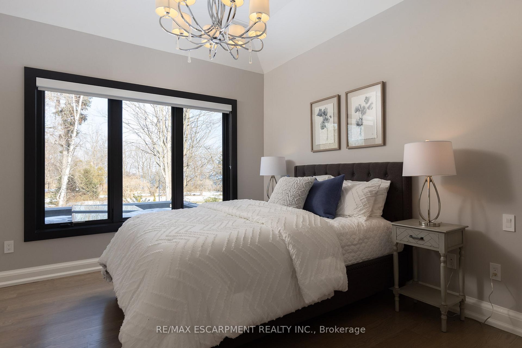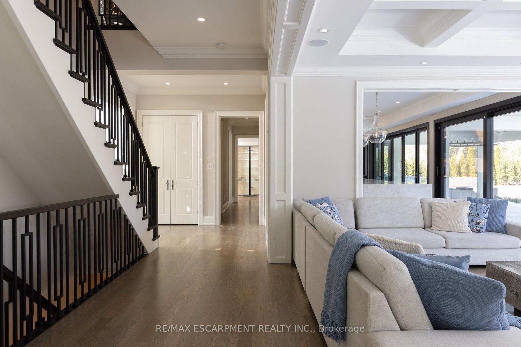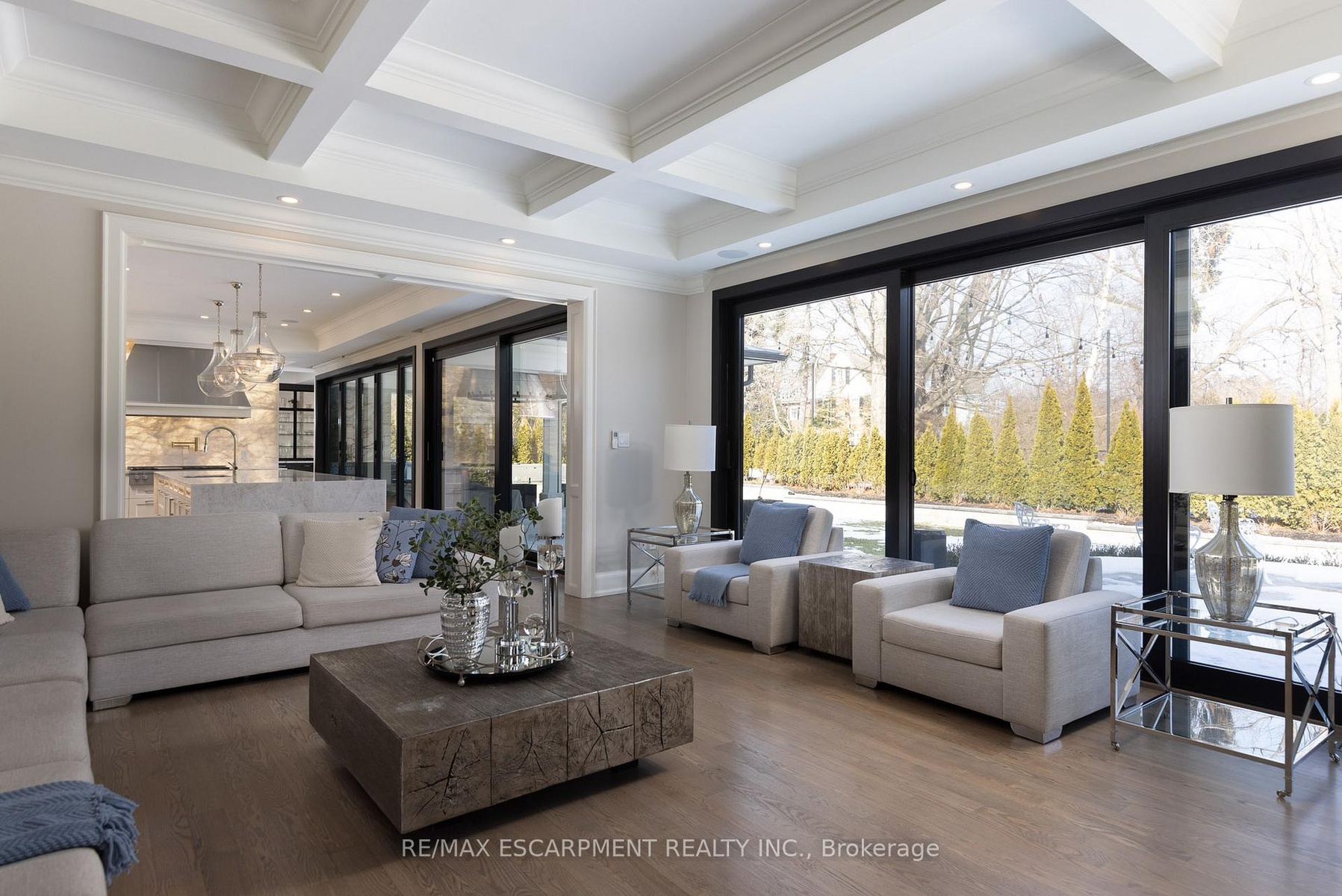 Located on the prestigious private lane of Lambert Common this masterful 8300 square foot plus home includes a seamless 2024 addition from the original 7 year old build. This custom residential design stuns with grand proportions and meticulous detail. All three levels feature 10-foot ceilings defining the home by its impressive rooms and an atmosphere of space and luxury. The entrance is both welcoming and breathtaking with it's incredible moldings and crystal chandelier casting diamond glints across the foyer flanked by the living and dining rooms. Stepping through to the back of the house, you will be dazzled by the panoramic views of wall to wall glass overlooking the two heated patios. The culinary wing is divided into two distinct zones for the ultimate hosting experience: The Showcase Kitchen: A visual centerpiece featuring a dramatic backlit stone wall that serves as a piece of living art. A 14-foot island, elegantly underlit to create a feeling of light providing sophisticated seating for six to enjoy the stunning kitchen. The Prep Kitchen: Positioned discreetly at the back of the main floor, this secondary kitchen allows for preparation to remain out of sight, ensuring the primary living space remains pristine. The home boasts five bedrooms with walk-in closets and ensuites. The Primary Suite is a dedicated sanctuary with his & hers walk-in closets, fireplace, and private bath, all oriented specifically to provide a serene, view of the lake, allowing the water to serve as a constant, tranquil backdrop. The upper level laundry room is spectacular an appliance package that includes a steam closet. The Entertainment & Wellness Lower Level Maintaining the same 10-foot ceiling height as the upper floors, the lower level is a destination unto itself. This level is fully equipped for a high-performance lifestyle, featuring and private glass enclosed gym, theatre room, open recreation room, secondary laundry suite and sixth bedroom with private office.