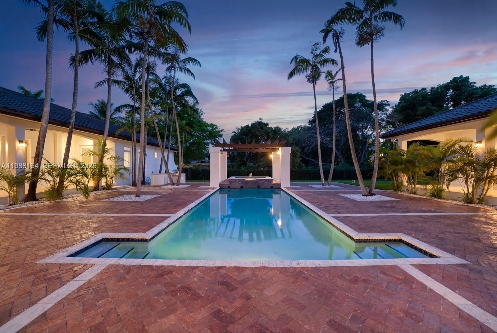 Welcome to your private oasis nestled on a coveted builder’s acre corner lot in the heart of Pinecrest. This gated Mediterranean-style estate offers 6,000 square feet of refined living with 6 bedrooms, 6.5 bathrooms, all on 1 level for maximum convenience. Soaring vaulted ceilings and abundant natural light create an effortlessly elegant atmosphere throughout. Step outside to discover mature oak trees, a sparkling pool and hot tub, and expansive outdoor entertaining spaces that feel like a personal resort. A three-car garage and private tree-lined entrance complete the picture. Minutes from top rated schools, pristine beaches, marinas, & premier shopping , this is South Florida living at its finest.