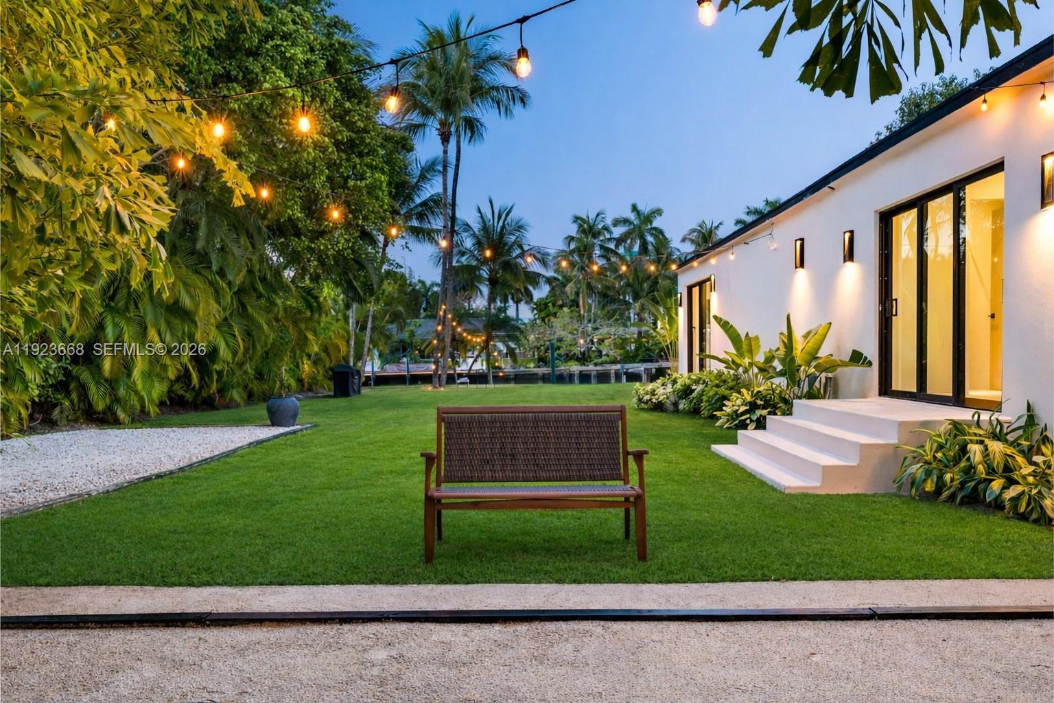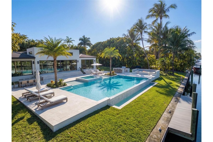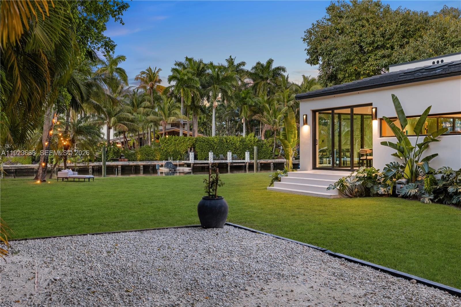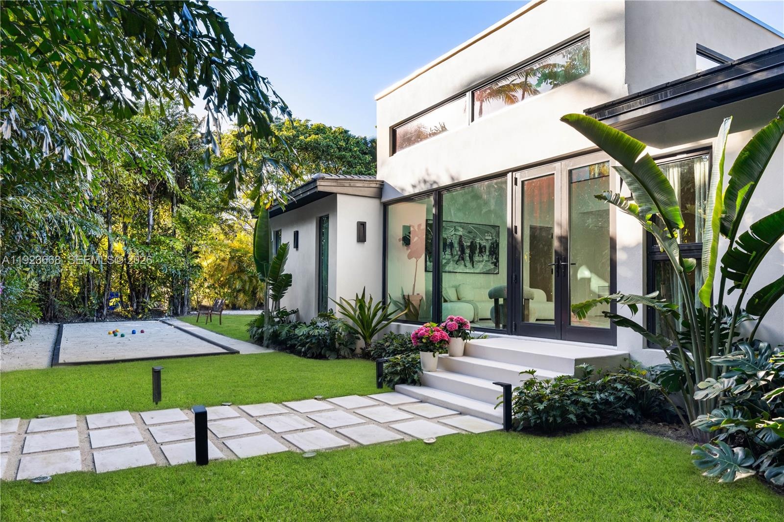 The 750 SF primary suite offers a true retreat with spa-style bath, steam shower, soaking tub, and designer stone finishes, complemented by a 225 SF custom walk-in closet with bespoke cabinetry, LED lighting, integrated sound, center island, and skylight illumination. Ideal for boating enthusiasts, the property provides direct bay access, shore power at the seawall, and an expansive yard perfect for entertaining. The grounds feature a full bocce court, lush privacy landscaping, and ample space for a future pool or expansion. Centrally located with top private schools including The Cushman School and Miami Country Day School. A rare opportunity to acquire a turnkey estate offering privacy, scale, and immediate Biscayne Bay access.