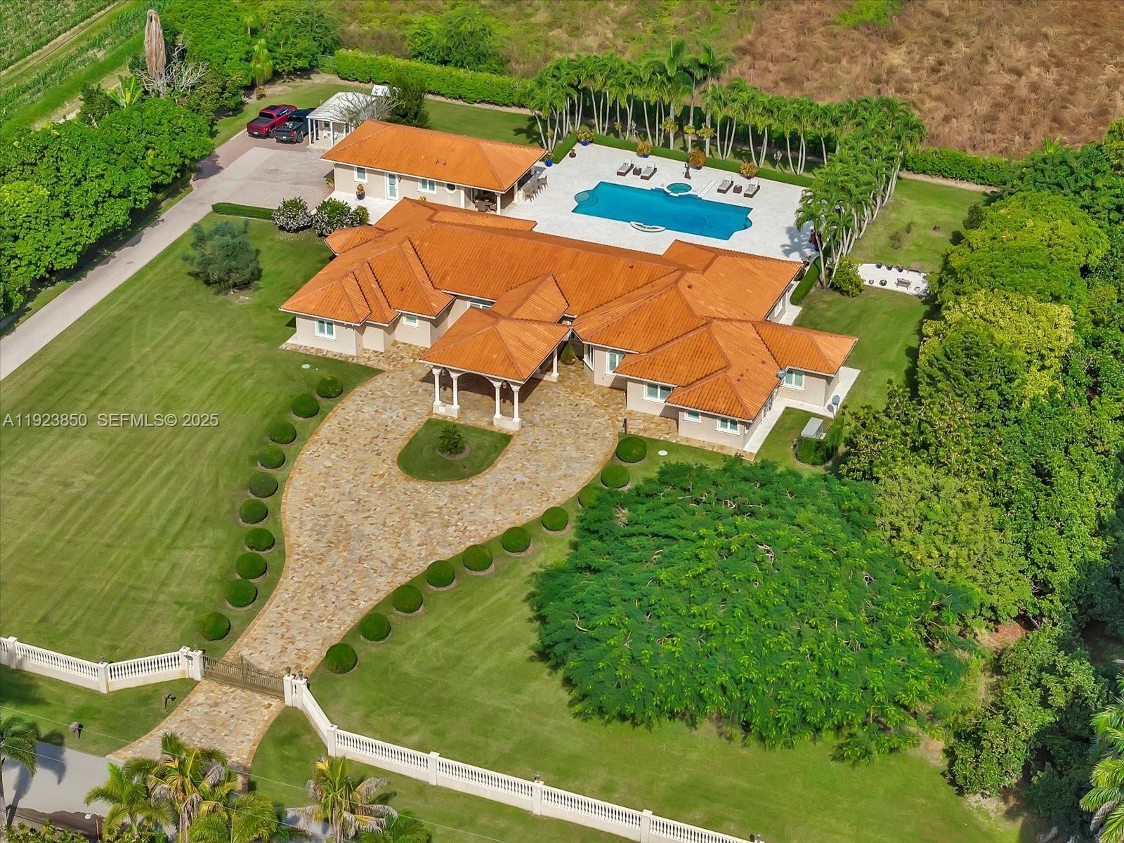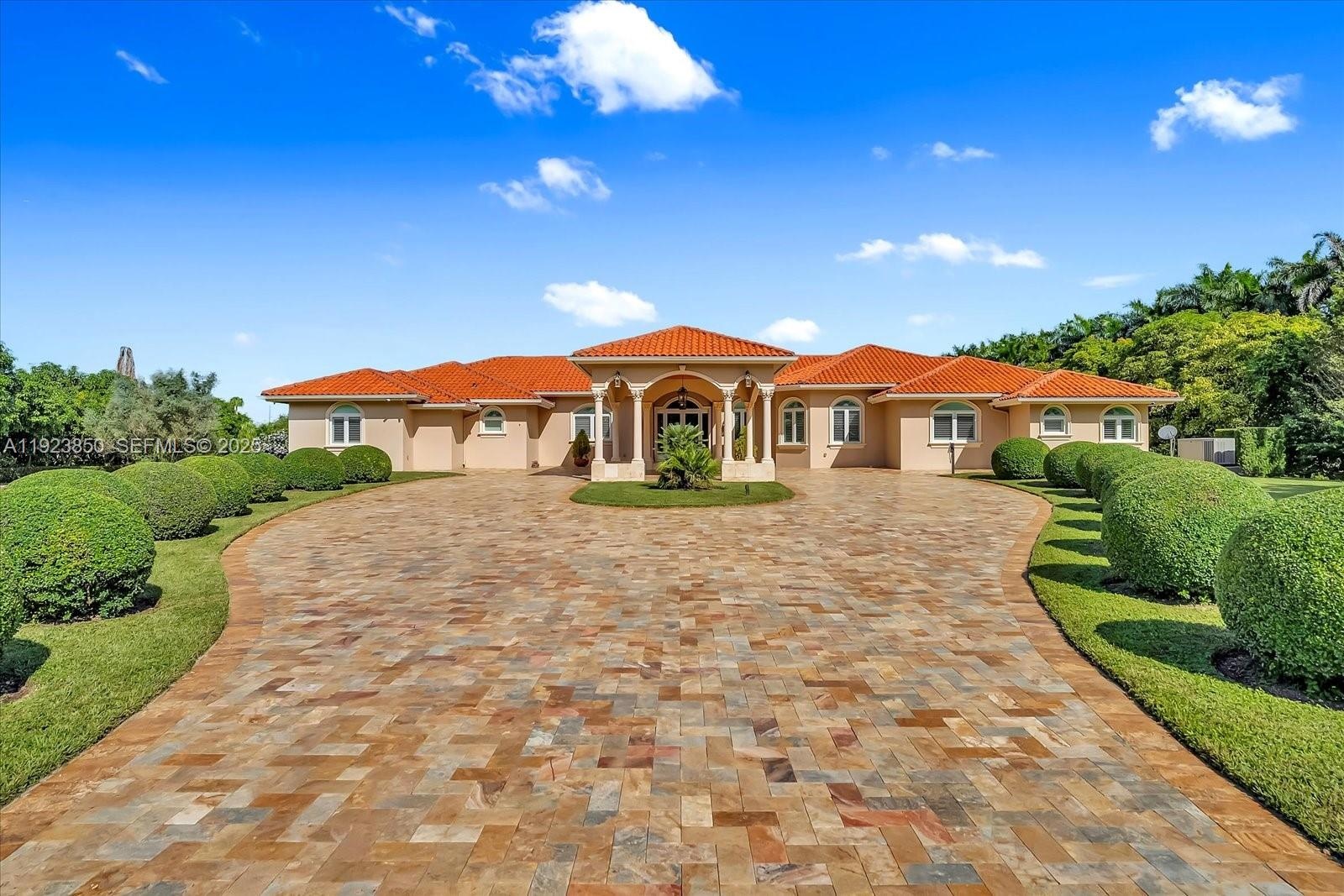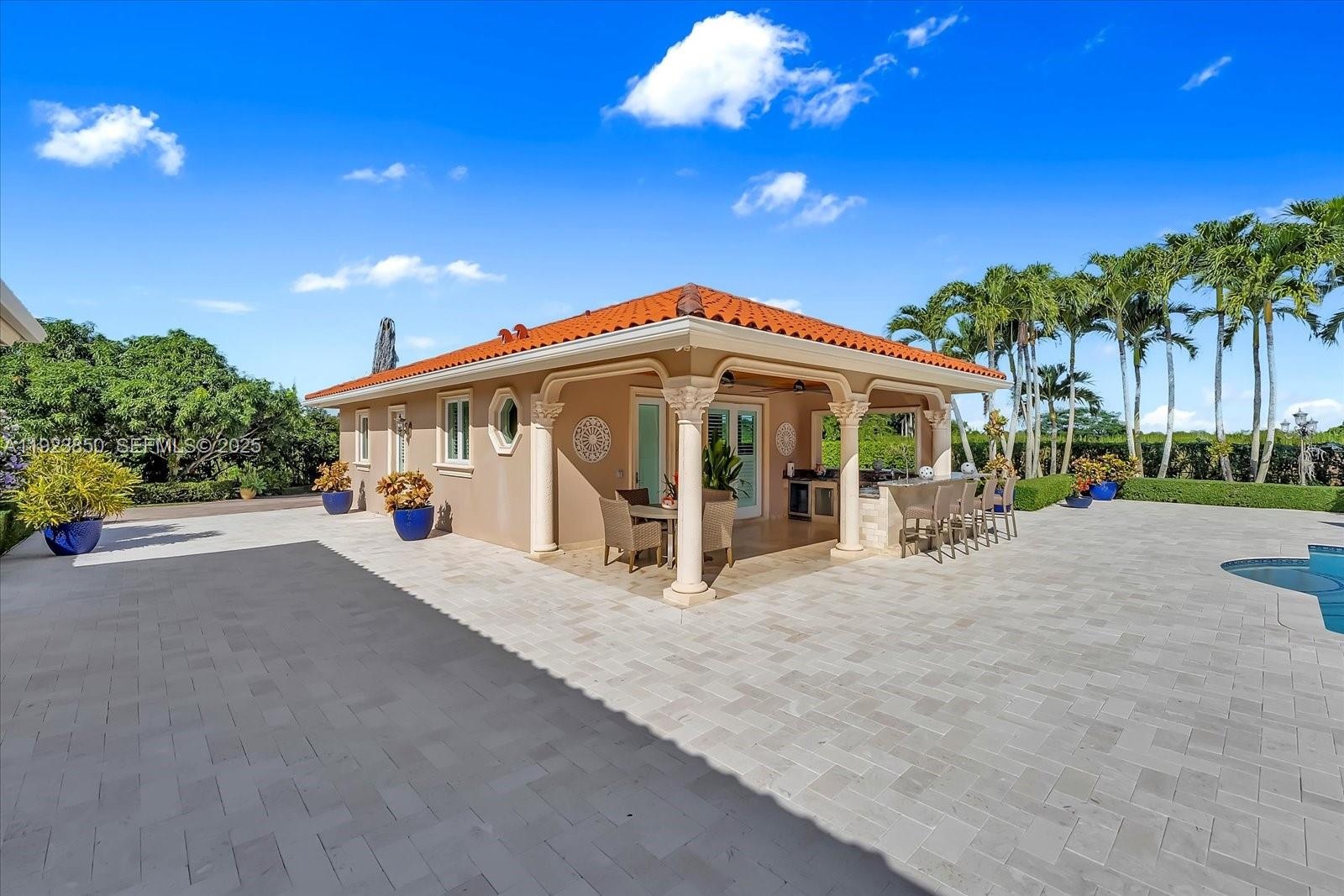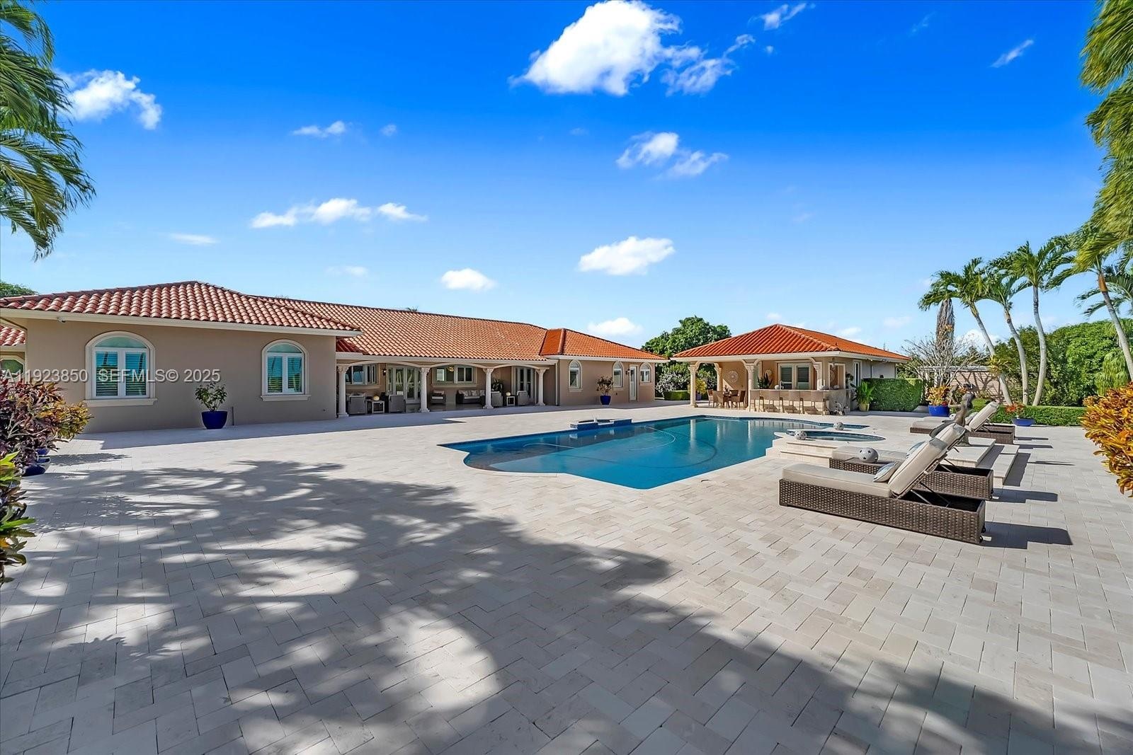 Welcome to this exquisite gated Mediterranean estate in highly sought after West Kendall, offering 5,405 sq ft of refined living space, including 5 bedroom suites—each with its own private bathroom. This elegant single-story residence impresses from the moment you arrive with its grand paver driveway, manicured landscaping, and stately architecture. The property features a detached two-car garage and an inviting cabana complete with a full outdoor kitchen, creating the perfect setting for entertainment and resort-style living. Inside, spacious living areas, high ceilings, and abundant natural light enhance the home’s timeless appeal. Nestled in a private, lush setting and centrally located near top-rated schools and major conveniences, this is a rare opportunity to own a true Miami luxury estate.