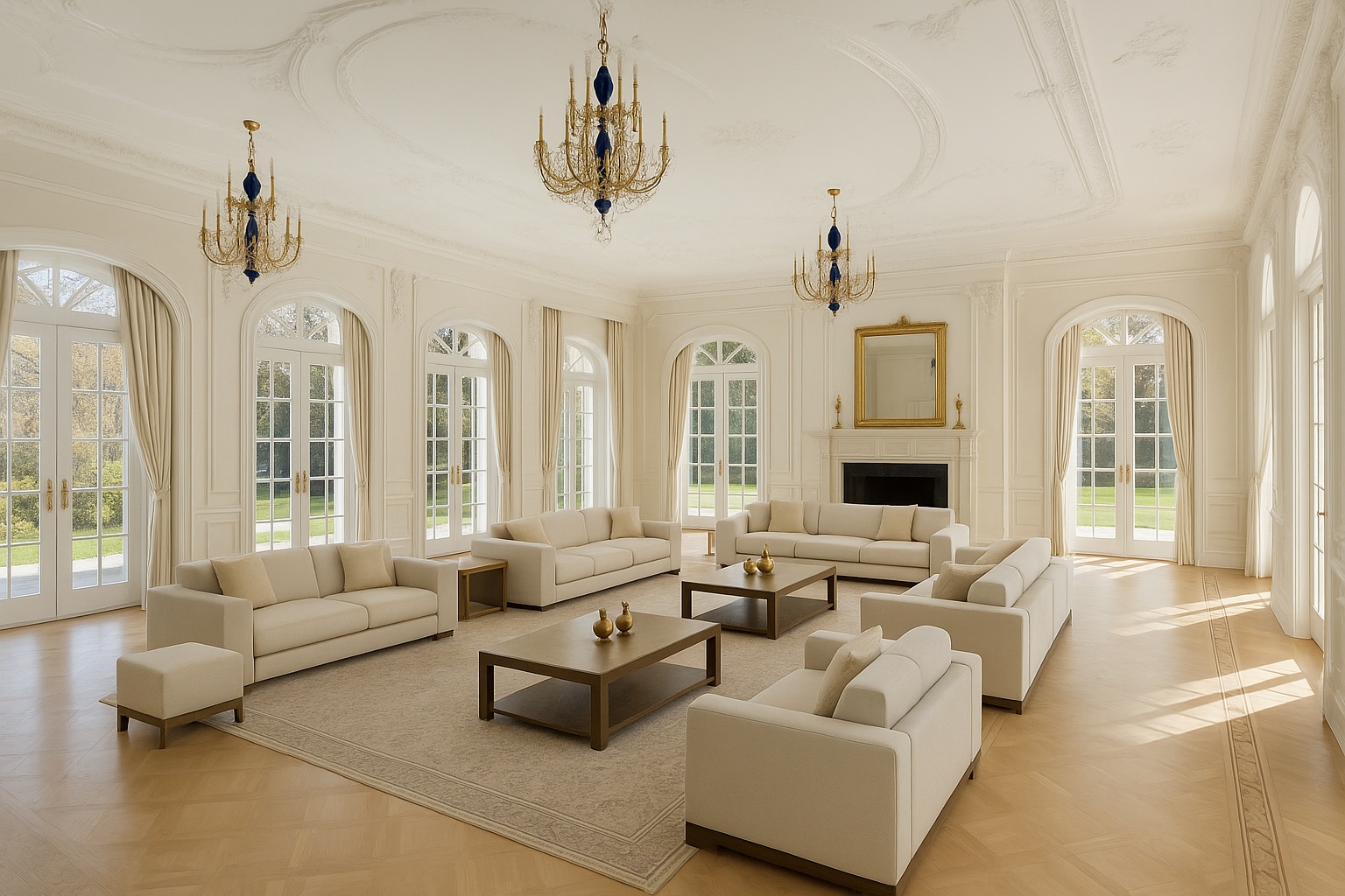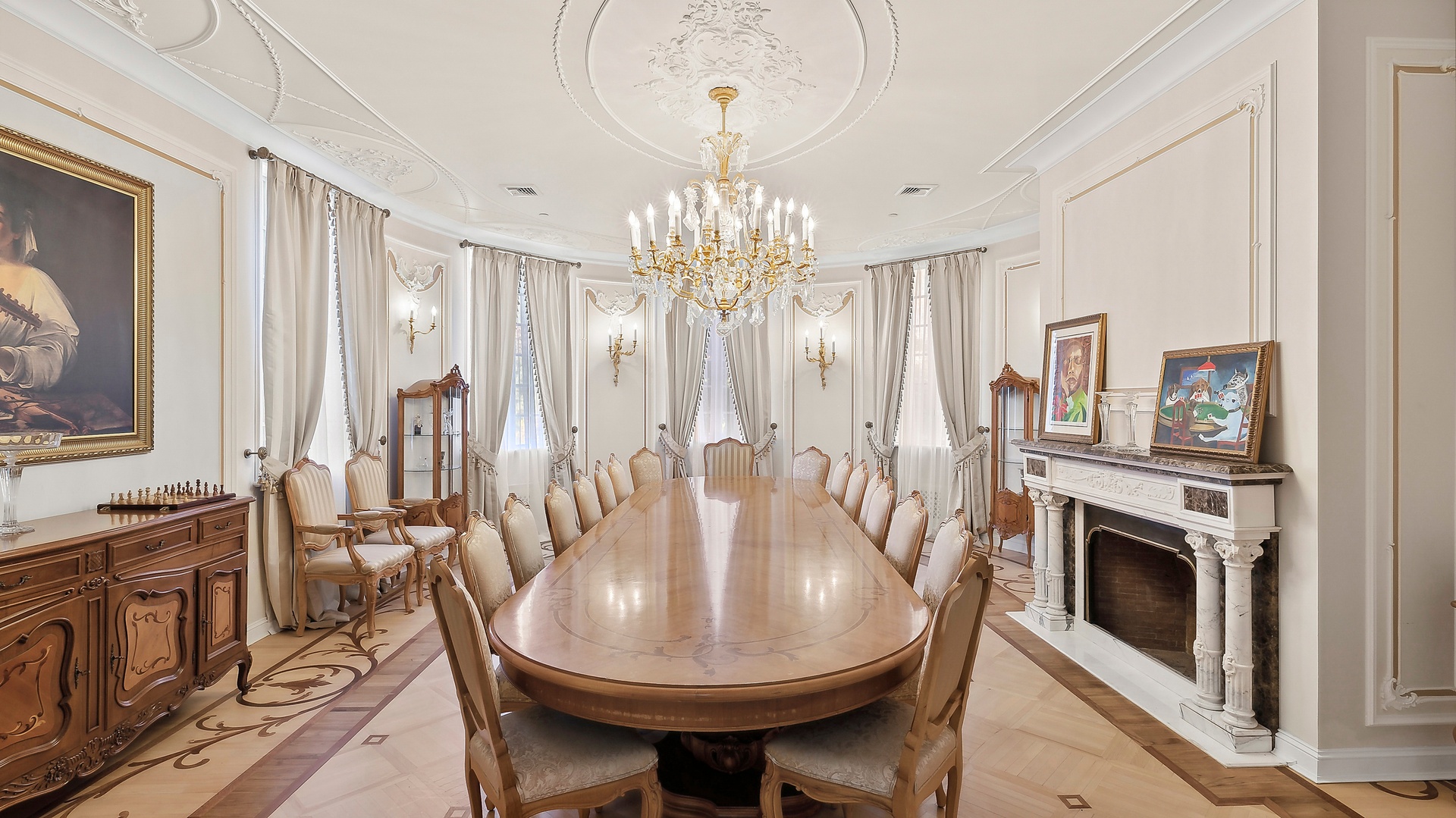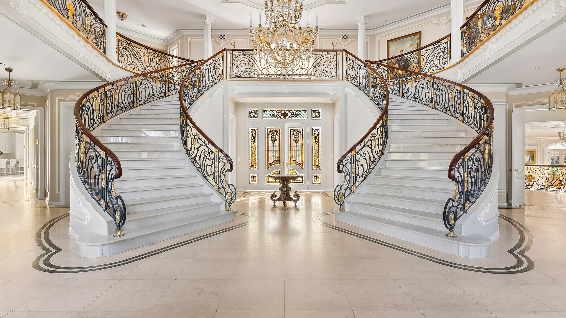 The residence is defined by volume and proportion. A Hermitage-inspired chandelier anchors the central hall, while a sweeping Italian marble staircase and custom ironwork introduce a consistent architectural language throughout.