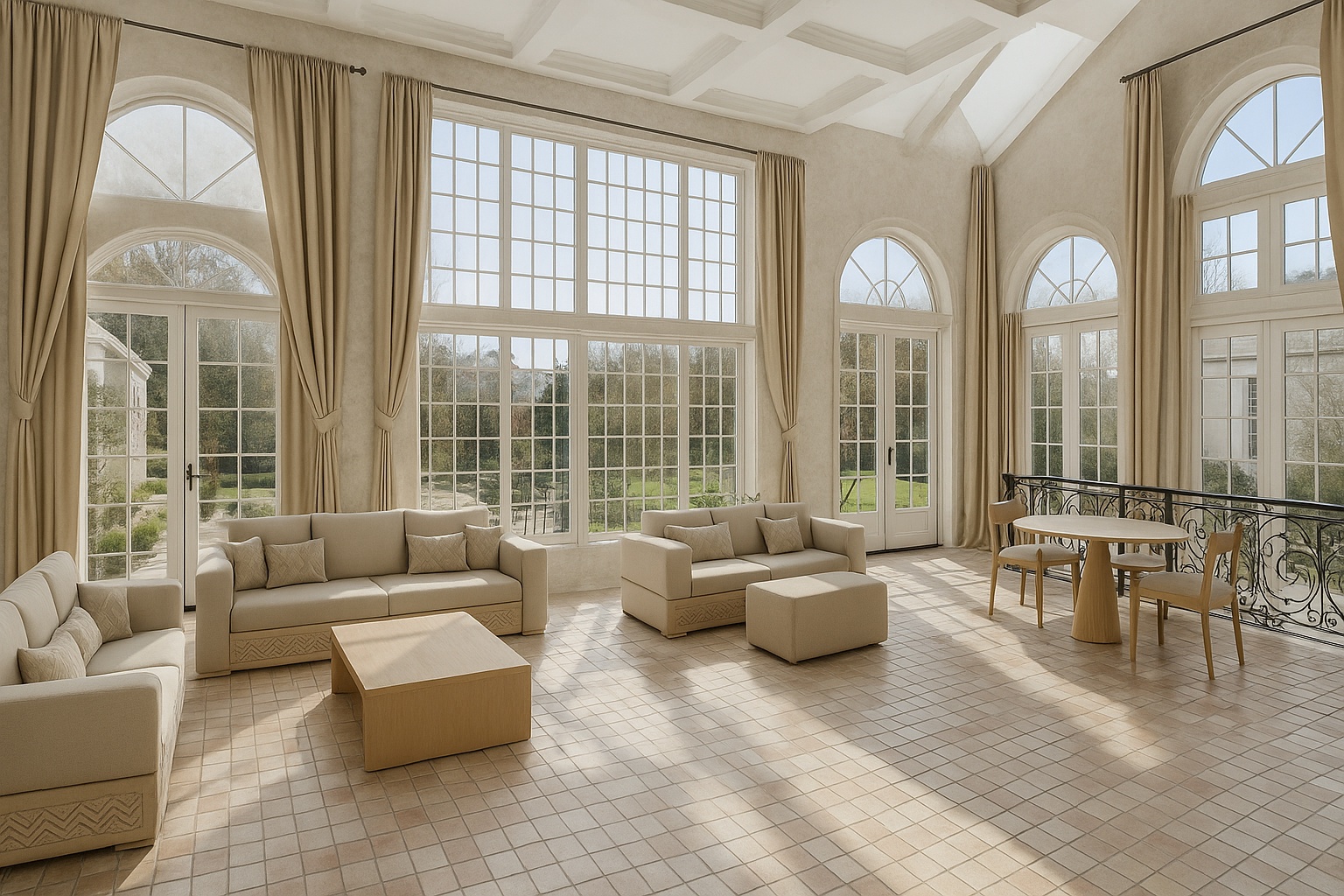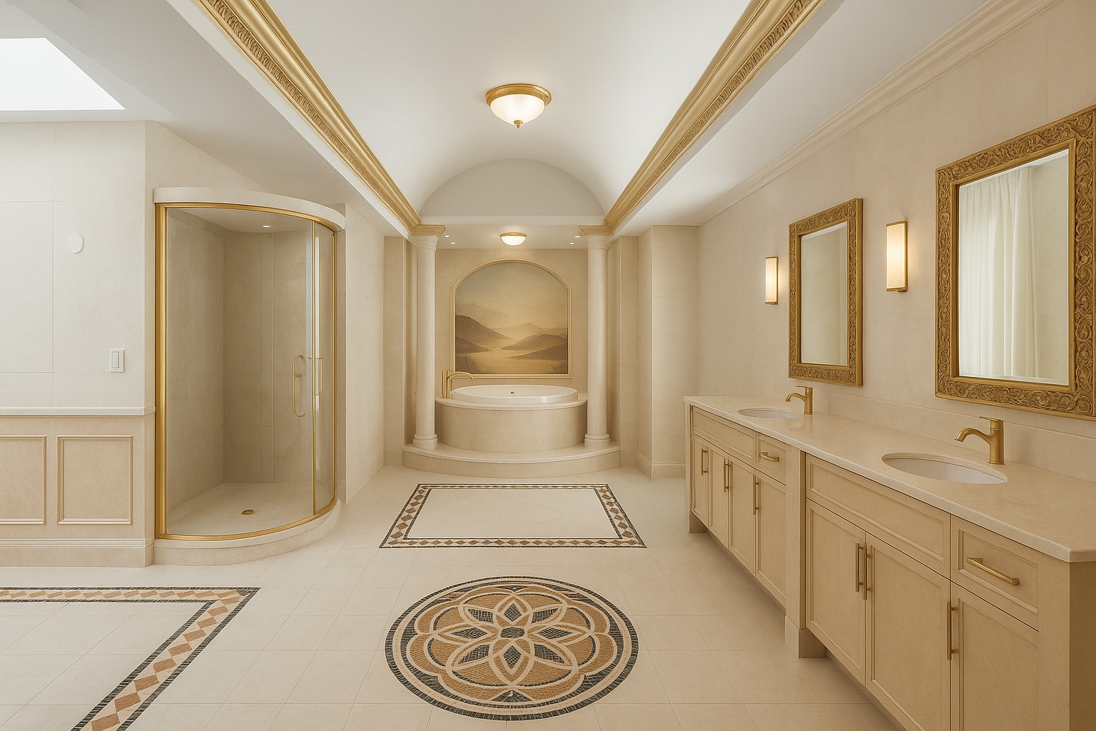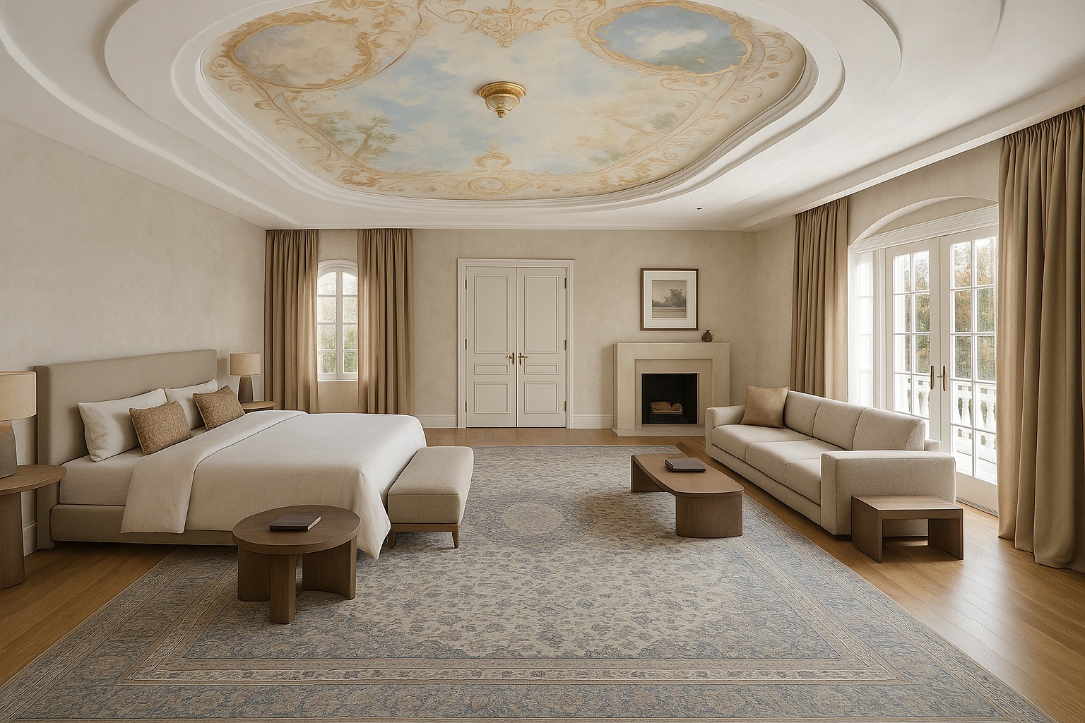 The residence is defined by volume and proportion. A Hermitage-inspired chandelier anchors the central hall, while a sweeping Italian marble staircase and custom ironwork introduce a consistent architectural language throughout.